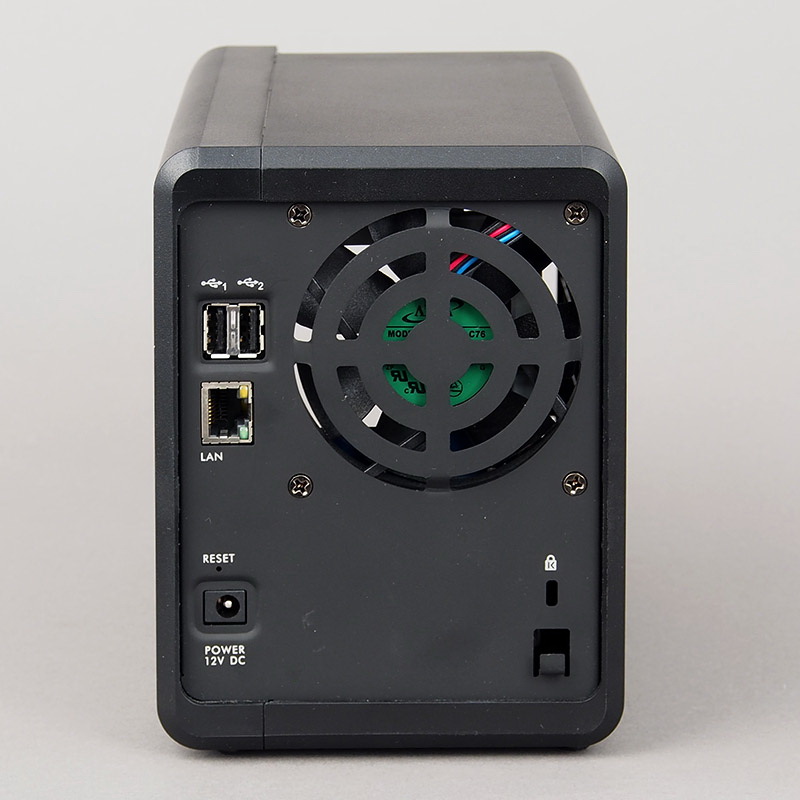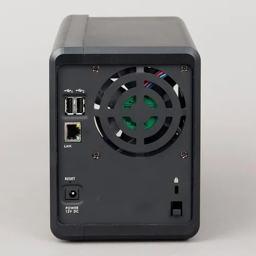 Hátul egy 60 mm-es ventilátort, két USB csatlakozót valamint a LAN portot találjuk, illetve ide került a tápegység csatlakozója is. A foglaltból látszik, hogy a tápegység külső – ez szintén megszokott, és a használatot egyáltalán nem befolyásoló dolog a NAS-ok esetében. A LAN gigabites, ezek az USB csatlakozók viszont csak a 2.0 szabványt támogatják, tehát a három port közül gyors kommunikációra csak az előlapi használható.