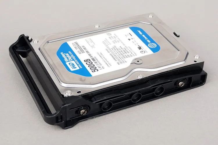 A NAS-ok többnyire elölről tölthetők, és ez igaz mostani tesztünk alanyára is. Viszont nem szedhető le a teljes előlap, a jobb oldali vékony sáv fixen a helyén marad. Természetesen 3,5 colos HDD-ket használhatunk, SATA csatolóval. A rögzítés nem csavarmentes, de véleményünk szerint ez nem probléma, mivel egy NAS esetében jellemzően nem cserélgeti senki a meghajtókat, az pedig bőven belefér, ha a kapacitás bővítése miatt pár évente néhány csavart is meg kell húzni. Egyébként természetesen az eszköz kompatibilis a 2,5 colos HDD-kel is, de ezek beszerelését a gyári csomagban lévő kellékekkel nem lehet megoldani; ami persze a házi megoldások alkalmazását nem zárja ki.