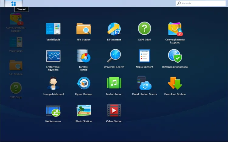 A DSM felépítése eléggé logikus, viszont néhány fontos rendszerfunkció nem a Vezérlőpult alá került, hanem külön alkalmazást kapott. Közülük a legfontosabb a Tároláskezelő, amivel a merevlemezeket tudjuk konfigurálni – vagyis azt beállítani, hogy milyen RAID módot (vagy módokat) szeretnék használni. Az alap szetthez tartozik még az EZ-Internet (ez az app biztosítja, hogy a NAS kezelőfelületét interneten keresztül bárhonnan elérhessük), a Hyper Backup (adatmentés külső adathordozóra, másik NAS-ra vagy online tárhelyre), a Médiaszerver (multimédiás tartalmak megosztása UPnP/DLNA/Apple eszközök felé) és a Cloud Station Server (adatok elérése interneten keresztül) is. És még néhány hasznos utility is, úgy mint Napló, Képmegosztó és Videomegosztó.