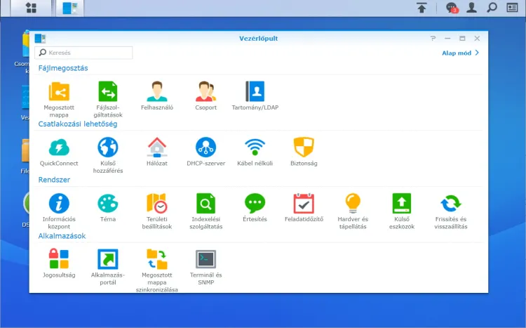 A DSM természetesen nemcsak külseje miatt nevezhető operációs rendszernek, hanem azért is, mert a benne lévő funkciók alkalmazásként, saját ablakban futtathatók. A Beállítások, a fájlkezelő (File Station) vagy éppen a képnézegető egymás mellett is szépen futnak – szemben a klasszikus webes kezelőfelületekkel, ahol minden egyetlen képernyőn, egyetlen szálon fut. Ez hatalmas előny, amely nemcsak meggyorsítja, hanem kényelmesebbé is teszi a NAS használatát. A rendszerbeállításokat a Vezérlőpultban találjuk, amely az elérhető opciókat négy csoportba rendezve tálalja: Fájlmegosztás, Csatlakozási lehetőség, Rendszer és Alkalmazások.