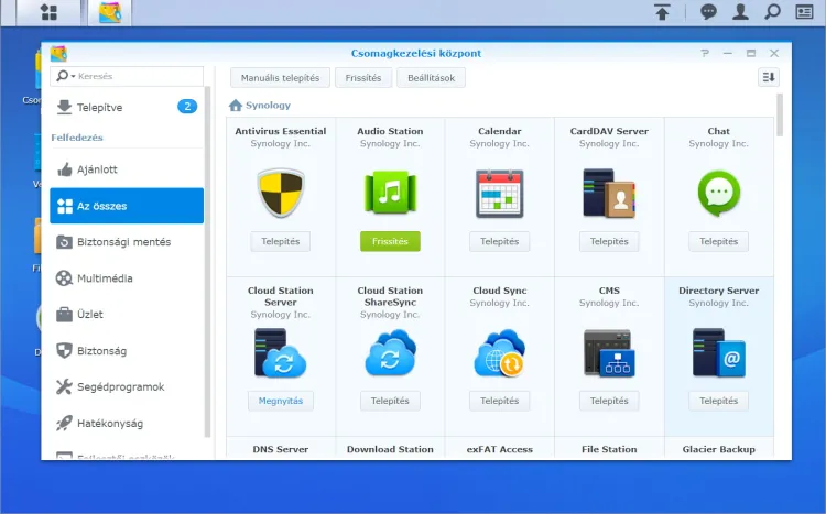 A Synology termékpalettája viszont elég széles, a legegyszerűbb, a kezdő otthoni felhasználóknak szánt termékek mellett szép számmal találunk vállalati felhasználóknak szánt típusokat is. Ezeket induláskor – szoftveresen – semmi sem különbözteti meg egymástól, viszont a Csomagkezelőben rengeteg extra alkalmazás van, amivel a NAS-t mindenféle okos dologra megtaníthatjuk. Összesen száz körüli az elérhető programok száma. A Synology alkalmazásboltjában a programokat témakörök szerint listázhatjuk (Biztonsági mentés, Multimédia, Üzlet, Biztonság, Segédprogramok, Hatékonyság, Fejlesztői eszközök), illetve kereshetünk is. Tény, hogy kicsit időigényes minden alkalmazást átbogarászni, de megéri: mivel csak azokat a funkciókat telepítjük fel a NAS-ra, amelyeket valóban használunk, biztosak lehetünk benne, hogy a teljesítményt nem fogják vissza a háttérben teljesen feleslegesen futó alkalmazások.