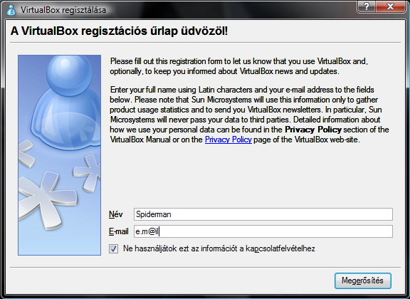 A VirtualBox első indítása után a kezelőfelület már magyar (ha a regionális beállításaink is azok). Először is regisztrálnunk kell a szoftvert, nevünk és e-mail cím megadásával.