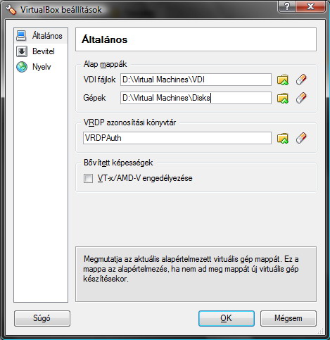 Mielőtt létrehoznánk első virtuális gépünket, konfiguráljuk a VirtualBoxot! Lépjünk be a Fájl menübe és válasszuk a Beállításokat. Az Általános fülön azAlap mappákat mindenképpen érdemes átállítani, hogy azok egy olyan partícióra mutassanak, ahol bőven van szabad tárolókapacitás. Ez főleg akkor fontos, ha a Pillanatképek szolgáltatást is használjuk majd.