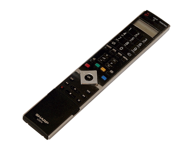 A Sharp távirányítóinál visszatérő gond, hogy a hangerőszabályzó és csatornaléptető gombok nem elég markáns megjelenésűek. Igaz, a csúcskategóriás tévéihez más távirányítót mellékel, (ehhez a típushoz a GA555WJSA jár), ám ez a tervezési hiányosság itt is megfigyelhető. További hiba, hogy a képarány választására szolgáló gomb az alsó lenyíló fedél alá került, ahol egyébként az AQUOS Link gombjai vannak még. A menübe léptető gomb messze van a menü vezérlésére használt összes többitől. Ettől eltekintve a leggyakrabban szükséges kezelőszervek éppen kézre esnek, az éjszakai használatot megkönnyítendő pedig a távirányító számgombjai, a hangerőszabályzó és a csatornaléptető háttérvilágítást is kapott. Tetszett a formavilág és a súlyelosztás is.