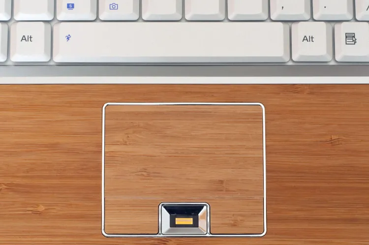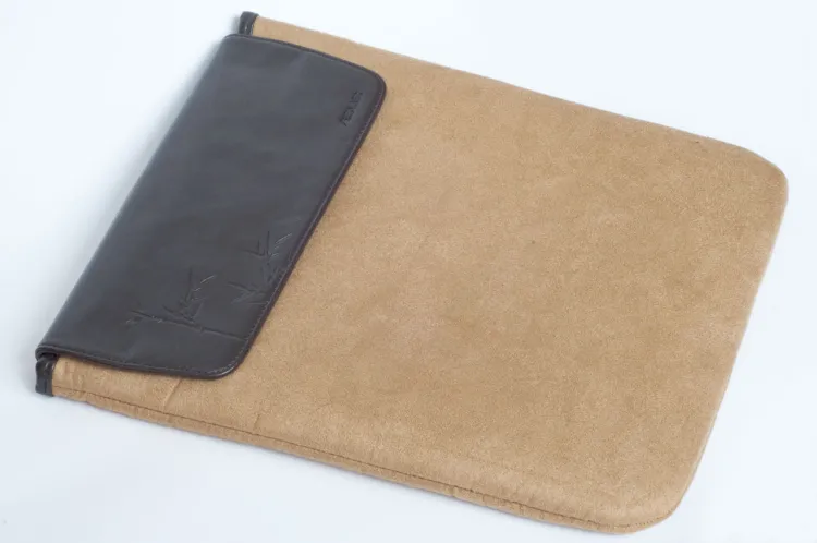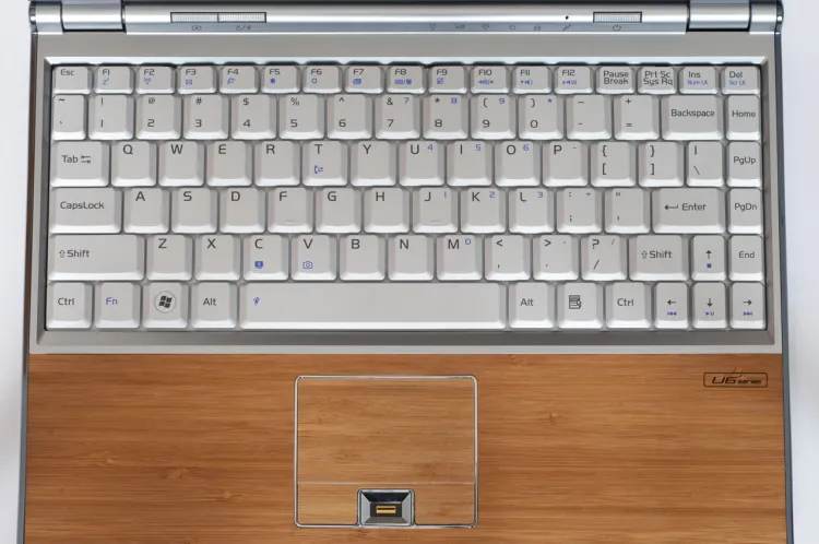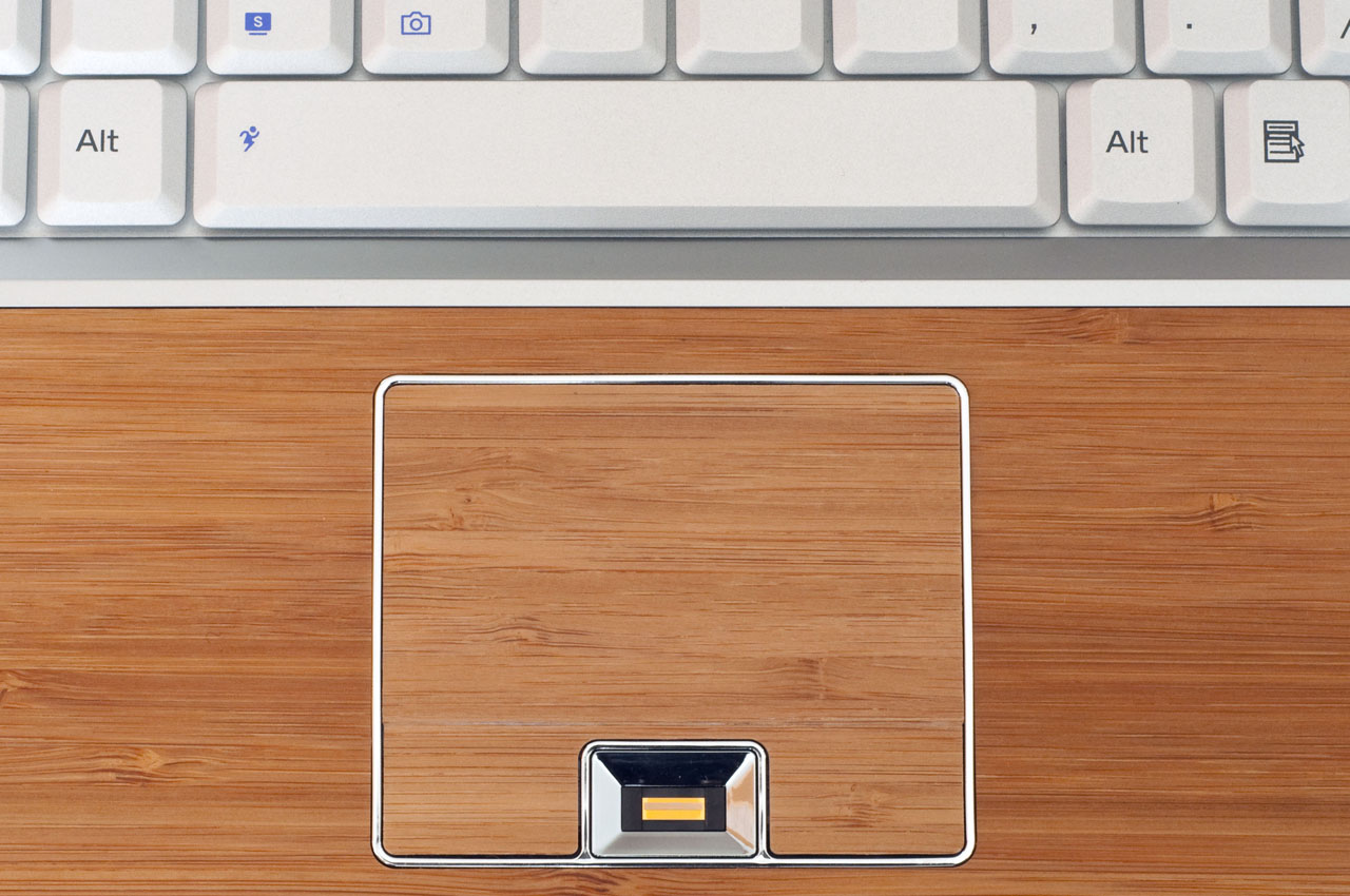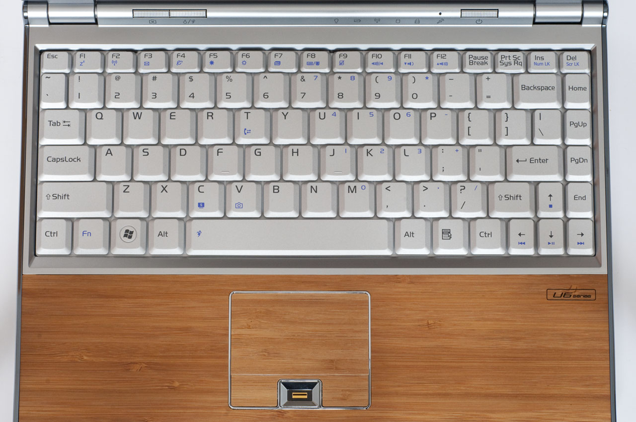 Az U6V legfeltűnőbb tulajdonsága természetesen a bambuszburkolat, ami nemcsak minden egyes példányt egyedivé tesz (változó erezete miatt), de kellemesen meleg tapintást is kölcsönöz a gépnek. Az ujjlenyomatokat egyáltalán nem gyűjtő anyagból a kijelző hátoldalára és a csuklótámaszra jutott, a tapipad pedig kifejezett élethű műanyag utánzatból készül, így tulajdonképpen bele is simul a csuklótámasz vonalába – gombjai közé pedig egy ujjlenyomatolvasó került. A különféle feliratok (ASUS és U6 series) beégetéssel készülnek. A gép többi része ezüstszínű és krómutánzatú műanyagból áll, az anyagválasztás az árszintnek megfelelően igényes, panaszra tehát nem lesz okunk.