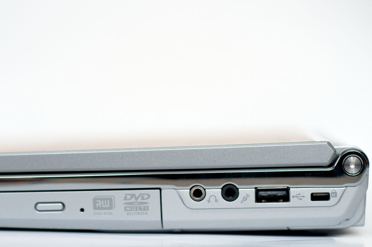 Szubnoteszhez képest az U6V egész jól felszerelt – ha körbeforgatjuk, a következő portokat és csatlakozókat találjuk rajta: a jobb oldal nagy részét az optikai meghajtó foglalja el, de mégis sikerült fölé bezsúfolni egy multi-kártyaolvasót, ami a megszokott szabványokkal (SD, MS) boldogul. Elfért még itt egy fülhallgató és egy mikrofoncsatlakozó, illetve egy USB port is. A hátoldalon egy „vak” modemcsatlakozó (egy ilyen drága notesznél talán elvárható lenne, hogy ilyen vakcsatlakozók ne legyenek) mellett a beépített gigabites Realtek adapter Ethernet portja kapott helyet, az akku másik oldalán pedig egy D-Sub kimenet.