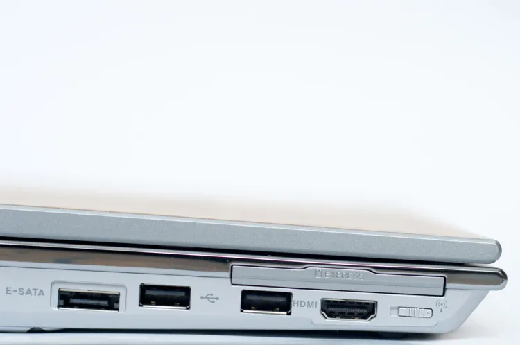 Az érdekes csatakozók nagy részét a bal oldalon találjuk, itt van például még két USB foglalat, egy E-SATA port és egy HDMI csatlakozó de ide került az ExpressCard bővítőfoglalat és a vezeték nélküli adaptereket kikapcsoló gomb is. Ez utóbbiakból egyébként egy Bluetooth 2.0 EDR és egy 802.11n-kompatibilis példány került a gépbe. A bal oldalon található még a hűtőrendszer kivezetése és a tápcsatlakozó.