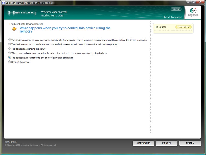 A Videók nézése PC-ről cselekvéssel hasonló eredményt kaptunk: a „vissza” gomb kivételével minden működött (a vissza helyett itt Enter volt beállítva alapból). A hibát az előbb leírt módon ismét sikerült orvosolni. A Media Centerből viszont manuálisan kell kilépni (alternatívaként a Harmonyt be tudjuk programozni úgy, hogy az egész PC-t kikapcsolja), de a Logitech mentségére legyen mondva, hogy a Microsoft saját MCE távirányítója sem nyújt egygombos kilépési lehetőséget.
