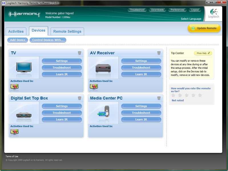 A távirányító természetesen tudja, hogy mi van be-, illetve mi van kikapcsolva, ezért nem fordulhat elő, hogy az erősítő és a tévé bekapcsolása helyett azokat szépen kikapcsolja. Az viszont lehetséges, hogy azért nem sikerül valamit ki- vagy bekapcsolni, mert a jel nem talált célba. A főmenüben a beállításokra (jobb felső sarok), majd a Devices gombra klikkelve az egyes hardvereket ilyenkor egyesével is irányíthatjuk.