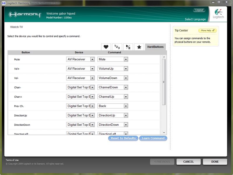 Ha mégsem, akkor az eredeti távirányító kódját vagy makrókat is megtaníthatunk a Harmony 1100-zal. Ezeket az opciókat a Troubleshoot menüben találjuk. A Setting és a Customize Buttons menük opcióival a Harmony működését a végletekig testre szabhatjuk. Az eszközök bekapcsolási sorrendjétől kezdve a kedvenc csatornák összeállításán át még az érintőképernyőn megjelenő gombok funkcióját és csoportosítását is megváltoztathatjuk.