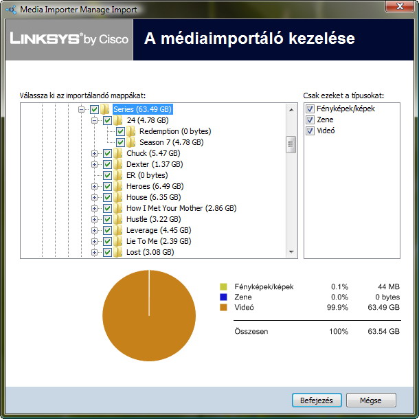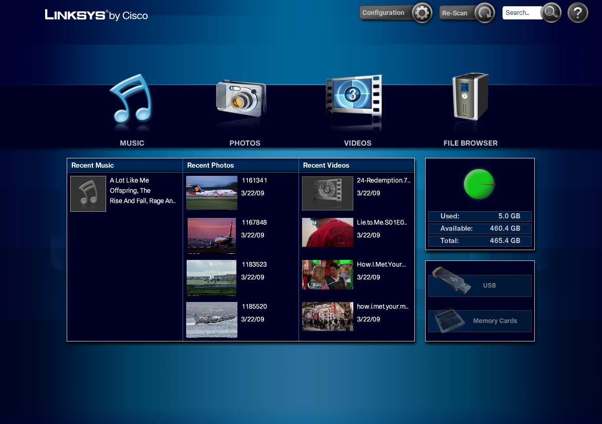Visszatérve a főmenüre, a zenék, videófájlok és képek (kategóriánként) egyetlen felületről érhetők el, függetlenül attól, hogy fizikailag a merevlemez melyik mappájában találhatók. A Cisco alapkoncepciója az volt, hogy a webes felületet böngészve a userek a zenéket és filmeket, valamint a képeket a böngészőn keresztül játszhassák le. A fent részletezett formátumokkal IE7 és Firefox 3 alatt nem volt gondunk, utóbbi esetében viszont telepítenünk kellett Windows Media Player Firefox modult is.