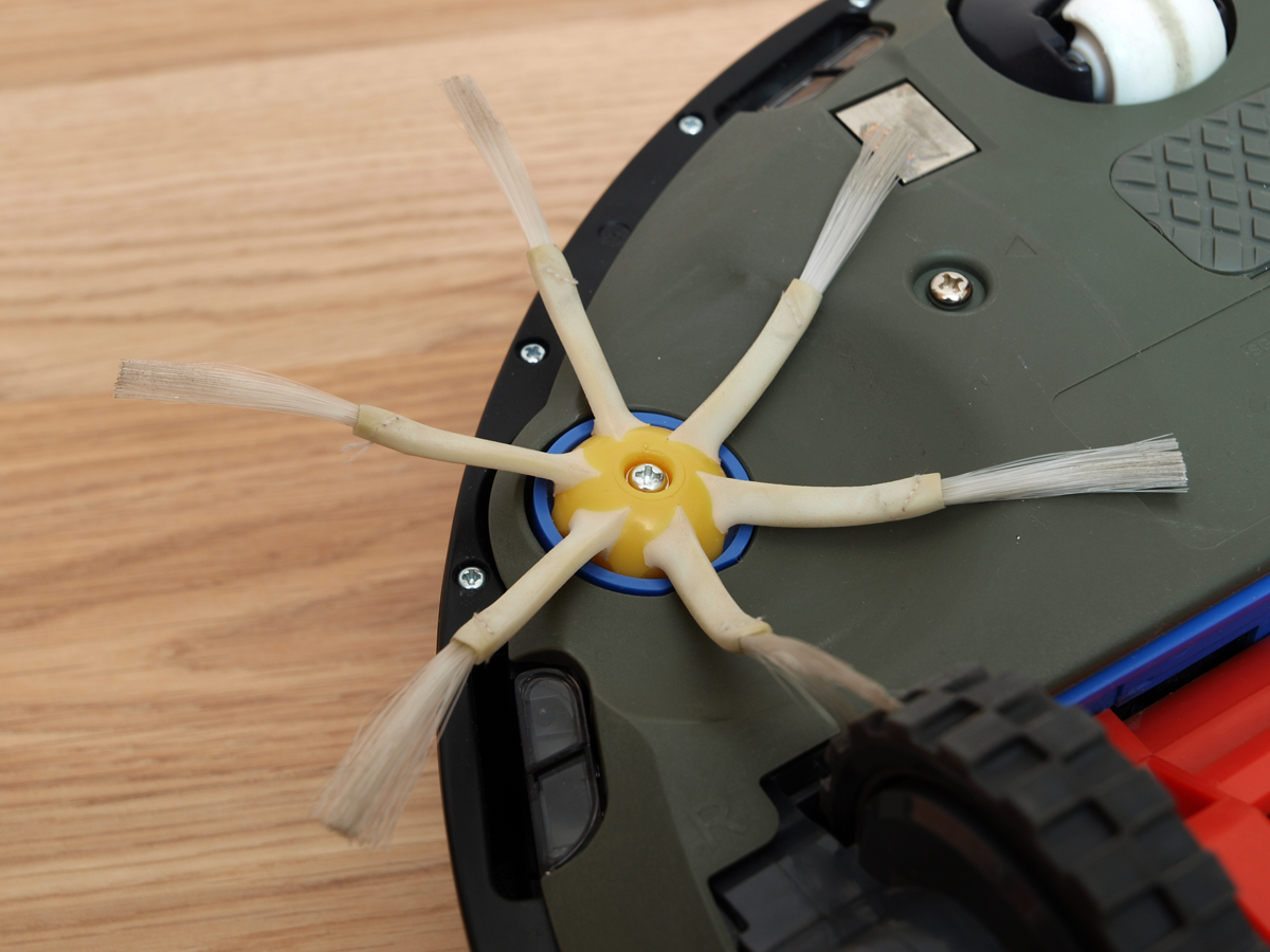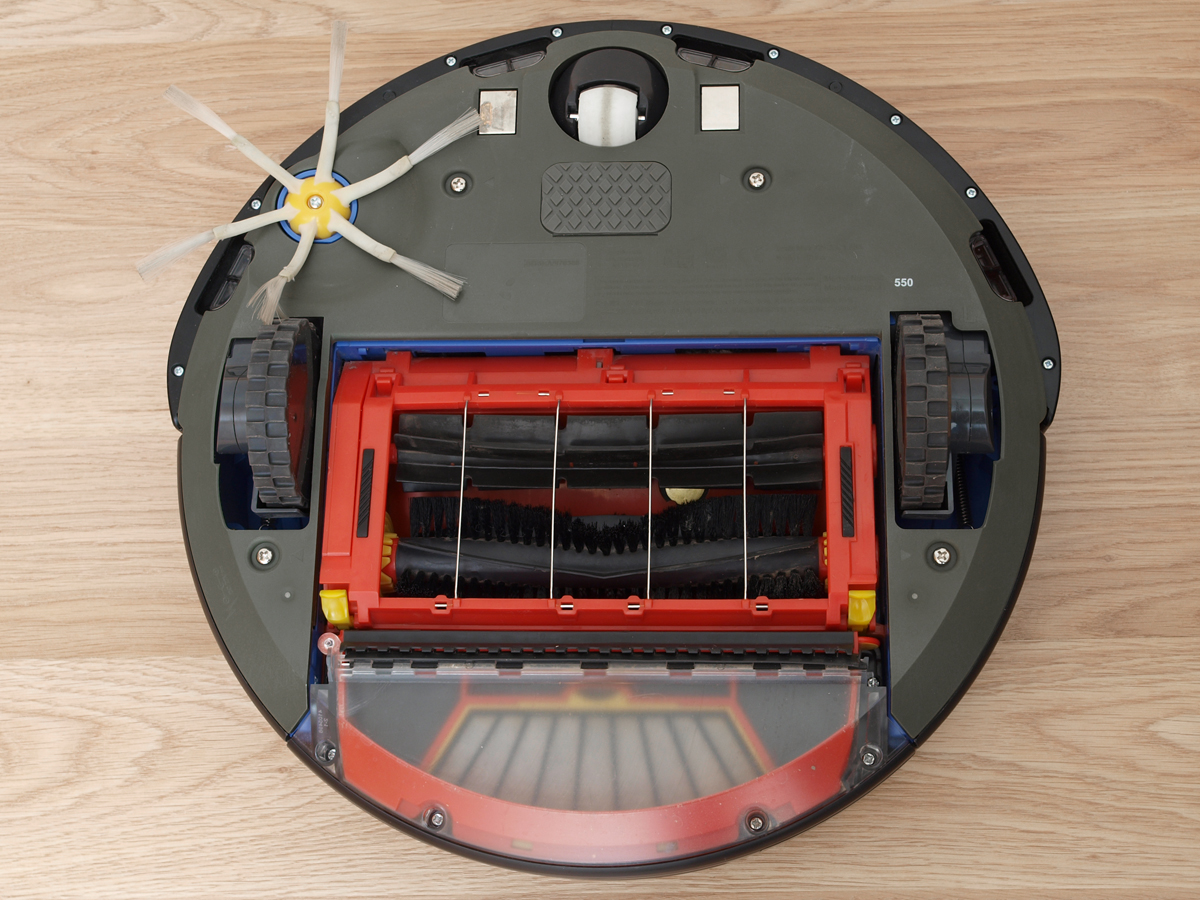 iRobot Roomba 560 fejjel lefelé: jól látható a gumilapátos henger és a mögötte lévő kefés hengeriRobot Roomba 560 oldalsó kefe