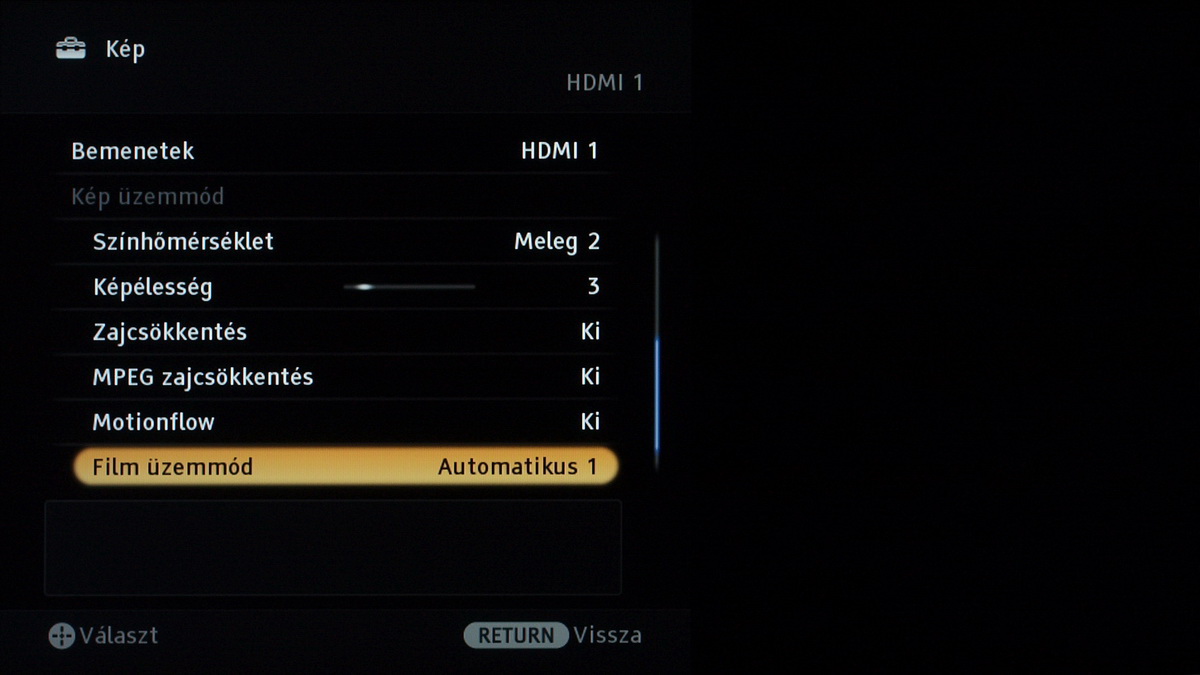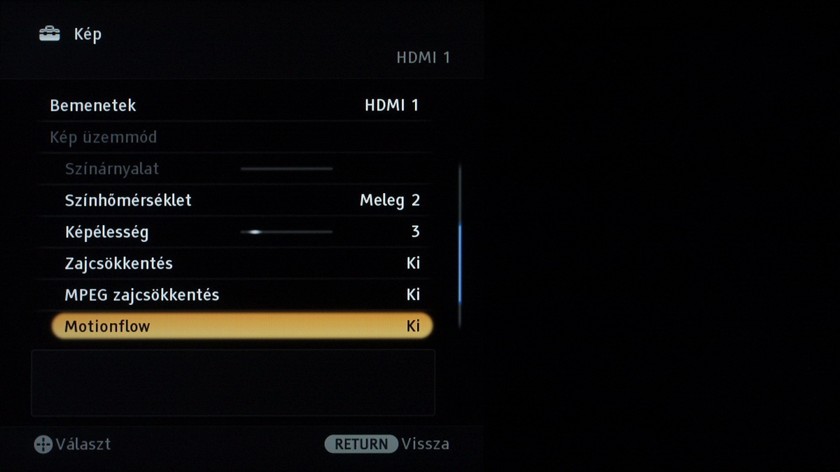 Ami a MotionFlow és a 24p hatását illeti, mindkettő jól működik, ezért használhatjuk mindkettőt bekapcsolva. Fontos viszont, hogy a MotionFlownál csak a Normál mód ad jobb képet, mert bár a Magas opcióval is folyamatos lesz a kép, ez már enyhén elmossa a részleteket. A 24p esetében nekünk az 1-es mód jött be, szerencsére a kevésbé agresszív működés itt is jellemzi a tévét. E két opció egyetlen kombinációja sem ad mesterkélt, már-már túl tökéletes képet. Még valami: ha a tökéletes moziélményre hajtunk, akkor a MotionFlow-t kapcsoljuk ki 24Hz-es jelforrás mellett, mert ebben az esetben nincs köztes képkockák kiszámolása, az elektronika egyszerűen képismétlést végez (valószínűleg 3:3-as pulldownt, de erre vonatkozó adatokat nem találtunk).