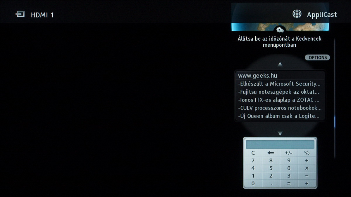 Az Applicasttal a legnagyobb bajunk az volt, hogy nagyon kevés az alkalmazás, tulajdonképpen az időjárás-jelentő és az RSS olvasó jelentik a választékot – a Sony már régóta ígéri további minialkalmazások beépítését, de a YouTube, Flickr/Picasa widget még várat magára. Összességében a Samsung Internet@TV és a Panasonic VIERA Cast rendszere is sokkal jobb szerintünk. Az viszont pozitívum, hogy a widgetek alapesetben nem foglalják el a teljes képernyőt, így lehet egyszerre tévét nézni, valamint RSS-ből híreket olvasni.