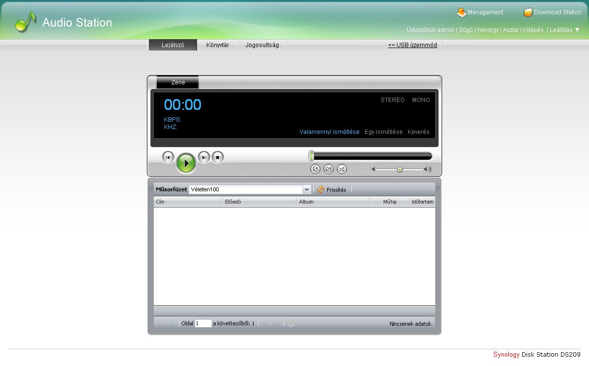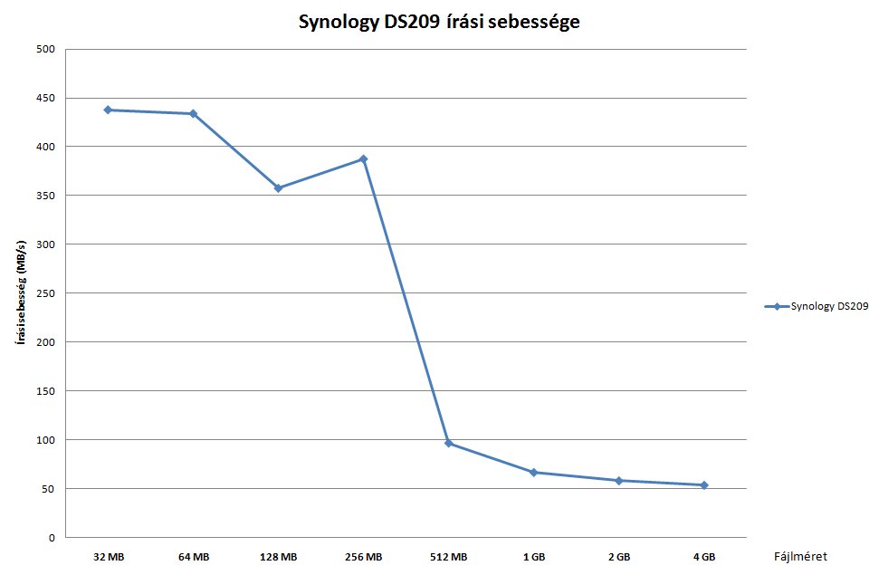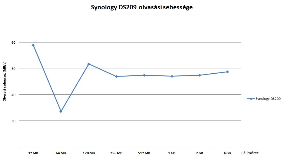 Ha csak adattárolásra használjuk a DS209-et, akkor a legfontosabb jellemző az adatátviteli sebesség lesz számunkra. Ezen a téren a Synology jó munkát végzett: egy nagy (5 GB-os) fájl írásakor 43,8 MB/sec, egy mindenféle méretű fájlt tartalmazó 3 GB-os könyvtárstruktúra írásakor pedig 16,4 MB/sec értéket mértünk. Ugyanezen adatok a NAS-ról történő adatolvasáskor: 48,4 illetve 19,2 MB/sec körül alakultak.
