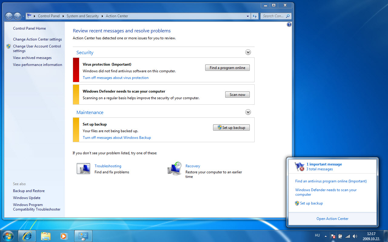 Figyeli a vírusirtó, a tűzfal, a kémprogramok elleni védelmi szoftver állapotát, a biztonsági frissítések sorsát, az internetes beállításokat, valamint a legfontosabb karbantartási funkciókat - köztük azt is, hogy készült-e már biztonsági mentés adatainkról. Ráadásul a problémák egy részére egygombos javítási módot is felkínál. A Műveletközpont a szó szoros értelmében természetesen nem egy biztonsági alkalmazás, mégis nagyon jó szolgálatot tesz, hiszen a kritikus rendszerelemeket monitorozza, és egy központi felületen gyűjti össze az információkat.