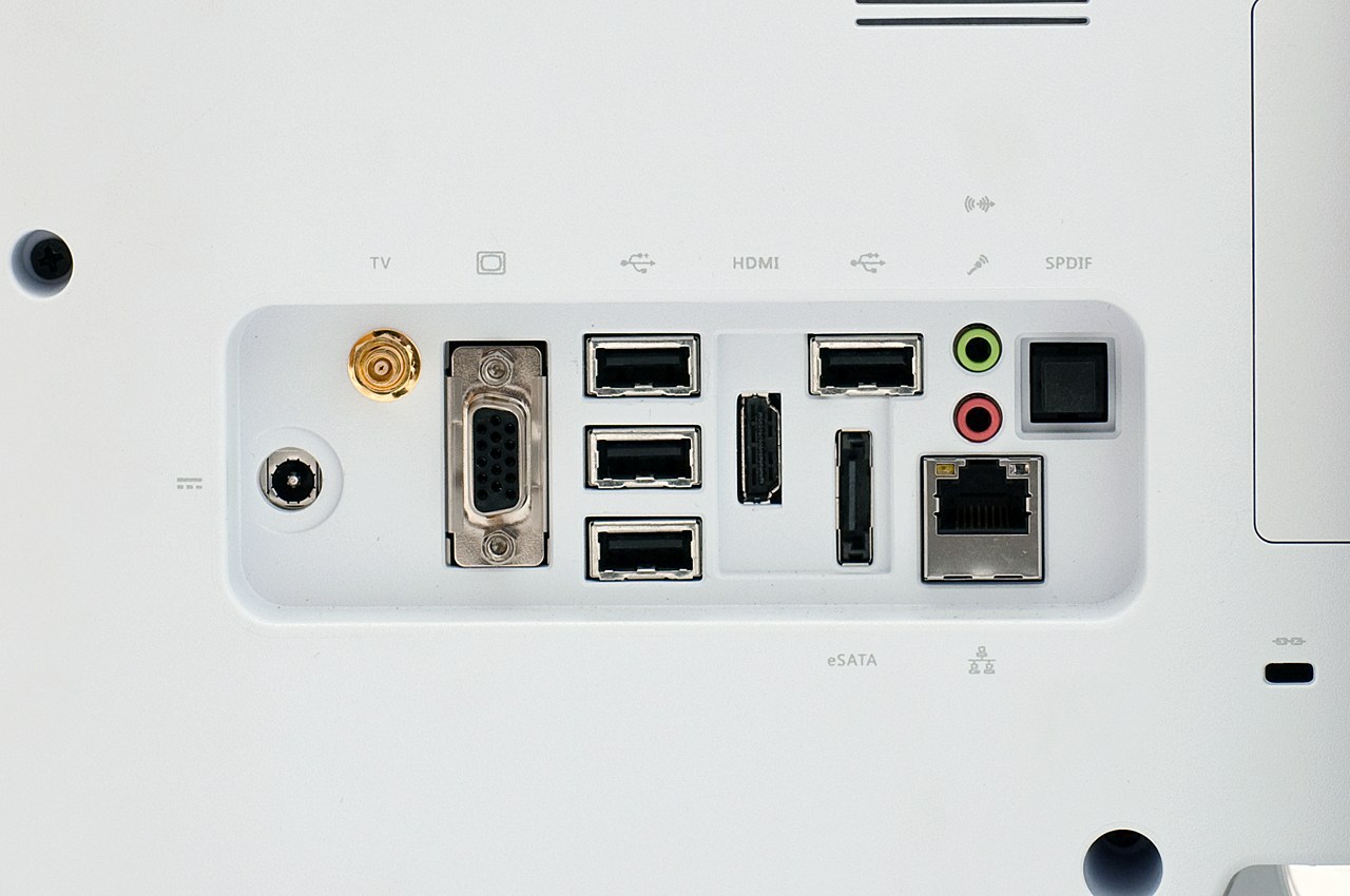 Az AE2220 legtöbb portja a hátlap (szemből nézve) jobb oldalára került: találhatunk itt 4 USB portot, egy eSATA csatlakozót, illetve a külső monitorok felé HDMI és D-Sub kimenetet is. Ide került a fülhallgató ki- és a mikrofon bemenete (a monitor felső kávájában webkamera van), illetve az SPDIF is, valamint a gigabites Ethernet port is. A beépített WLAN adapter 802.11n-kompatibilis, tehát hálózati gondjaink nem lesznek.