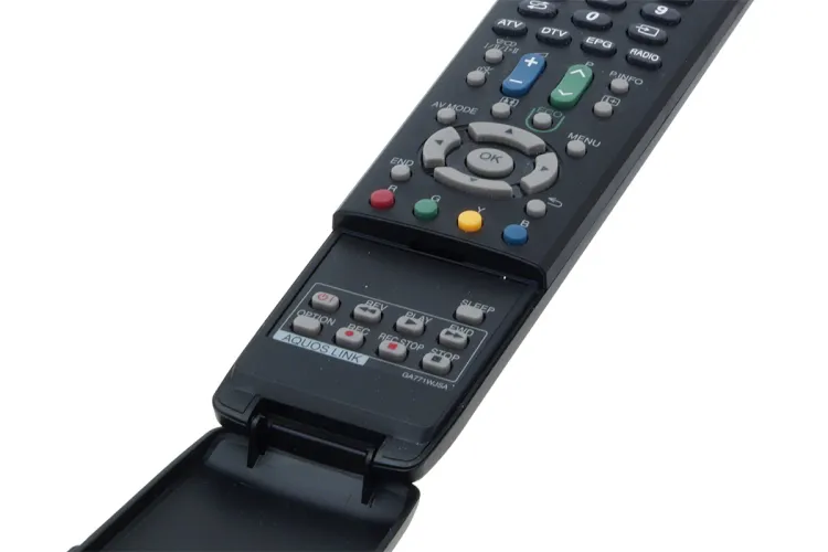 A tévéhez mellékelt távirányítóval korábbi tesztjeink alkalmával már többször találkoztunk; például a DH77-es széria és az XL8E széria esetében is. A mellékelt modell kényelmes tartású, és a legfontosabb funkciókhoz (színprofilok, képarány) közvetlen elérést biztosít. A vezérlő lehajtható fedél alatt az AQUOS Link használatához szükséges gombokat is tartalmazza, amelyekkel a kompatibilis Sharp DVD- és Blu-ray lejátszók vezérelhetők.