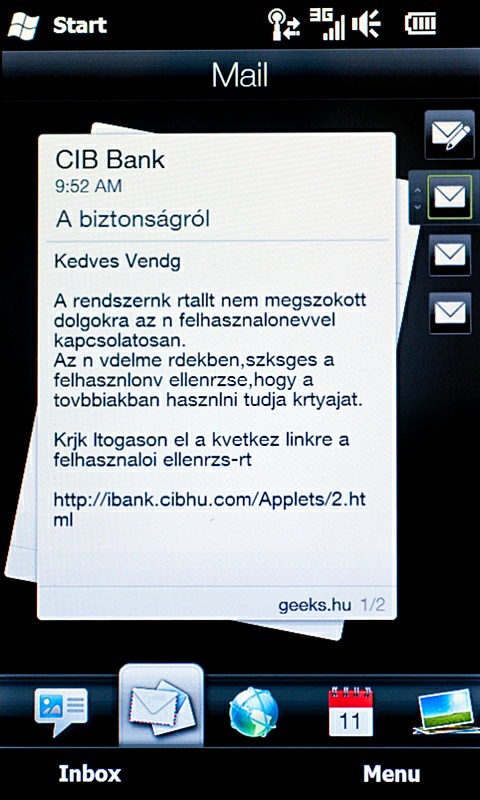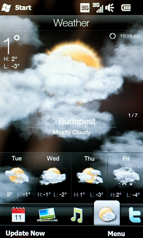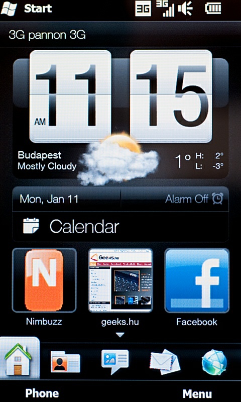 A névjegyzék például integrálható a Facebookkal, így ismerőseink neve és telefonszáma mellett megjelenhet a Facebook-profilra feltett kép és az onnan leolvasható adatsor is. Az SMS- és levelezőablakokat is átdolgozták, ám ez utóbbi sajnos valójában csak egy előnézeti kép a megszokott Windows Mobile szoftverhez, így használhatóság szempontjából nem a legjobb; az nagyon jól néz ki, hogy az egyes levelek „egymásra hullanak”, csak éppen ahhoz, hogy rendesen elolvassuk őket, be kell lépnünk az eredeti alkalmazásba. Hasonló effekteket kapunk a képnézegetőnél, a csúcspontot pedig a minden időjárási eseményt érdekes animációval bemutató Weather funkció jelenti (eső esetén például ablaktörlő törölgeti a képernyőt).
