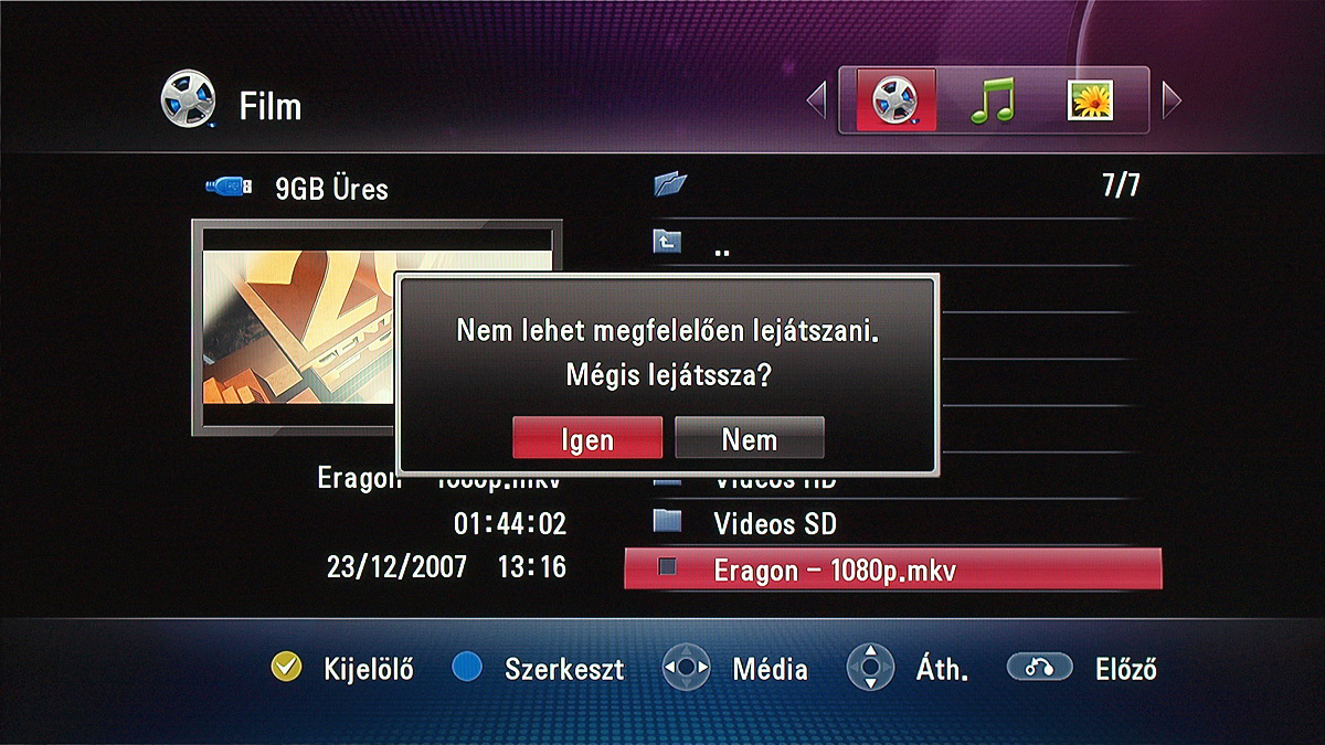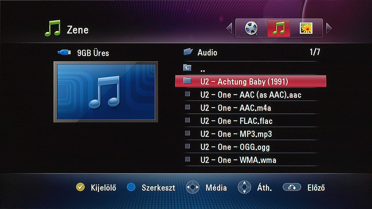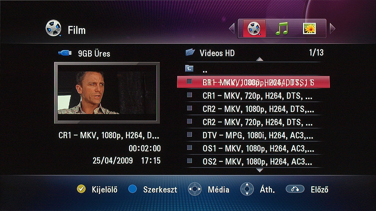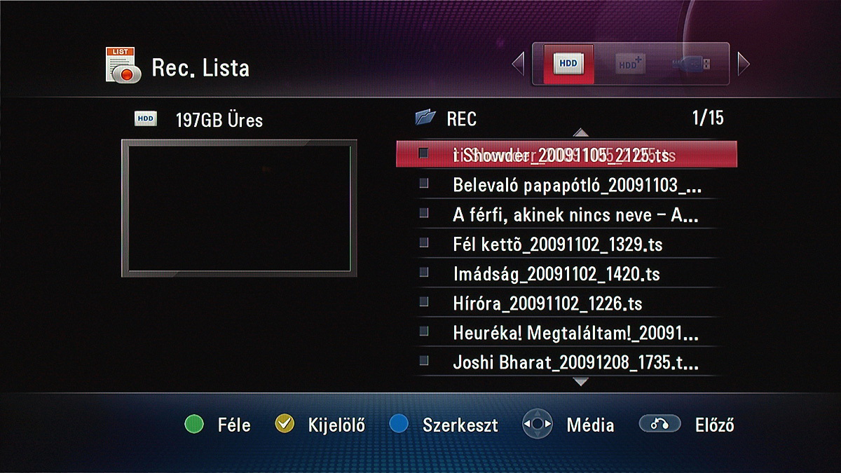 Alapvetően mindegy, hogy a médialejátszóval a korábban felvett tévéadásokat, a saját merevlemezen tárolt fájlokat, USB-s meghajtón lévő fájlokat, vagy hálózati helyen lévő fájlokat szeretnénk lejátszani (az NTFS fájlrendszer is támogatott); ugyanazok a navigációs lehetőségek állnak rendelkezésre. A fájlkezelő kinézetét igény szerint változtathatjuk, szerintünk a lista mód a legjobban áttekinthető, de kérhetünk kisebb vagy nagyobb előnézeti képeket is.