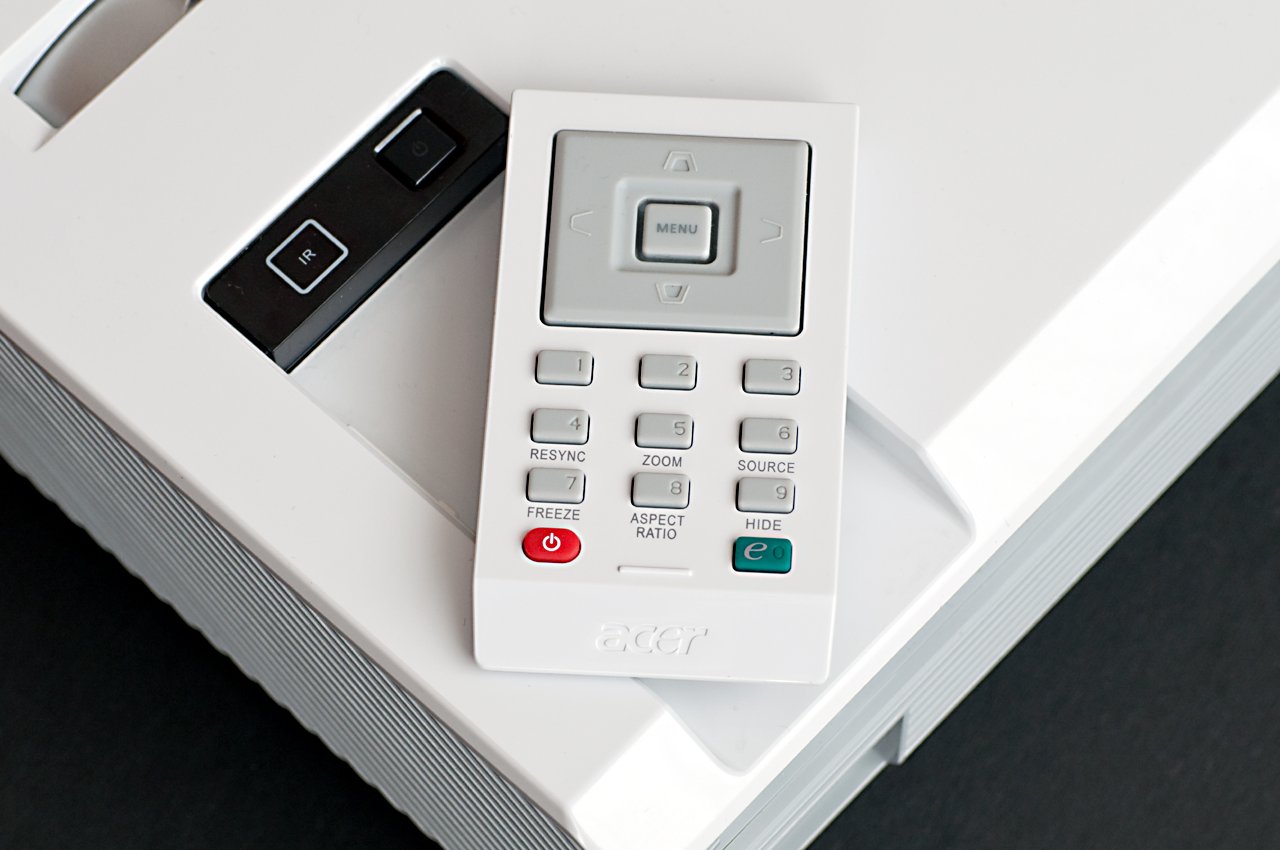 Az Acer ötletes módon oldotta meg a távirányító és a vezérlőpanel kérdését: ez a kettő ugyanis ugyanazt a fizikai egységet takarja. A vaskosabb hitelkártyaszerű távvezérlő használaton kívül becsúsztatható a kivetítőn található sínbe, és így kezelőpanellé alakul. A csatlakozás pusztán mechanikus, a jelek átvitele ekkor is infravörös úton történik, az ötlet pedig remek: a legritkább esetben van ugyanis szükségünk egyszerre mindkét irányítási lehetőségre – viszont gond adódhat, ha elvisszük magunkkal a kivetítőt, de véletlenül otthon (vagy munkahelyünkön) felejtjük a vezérlőt.