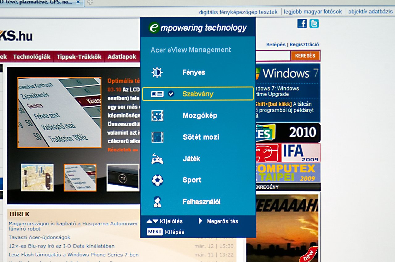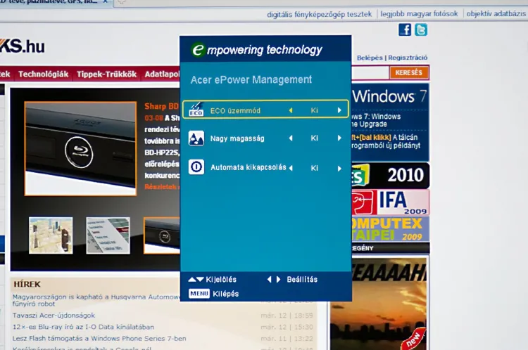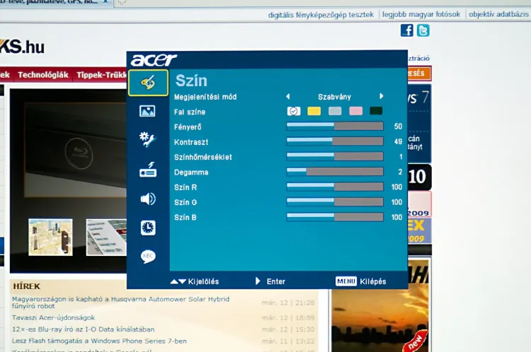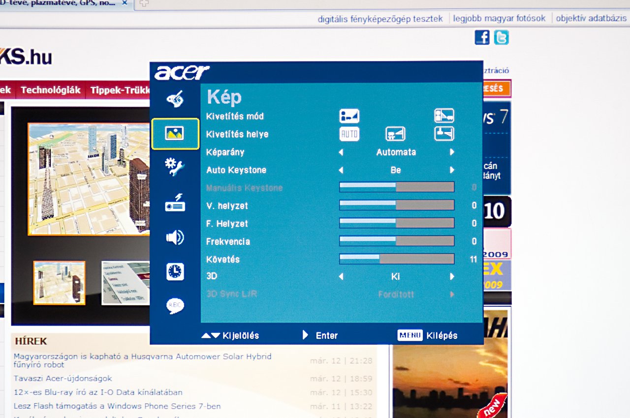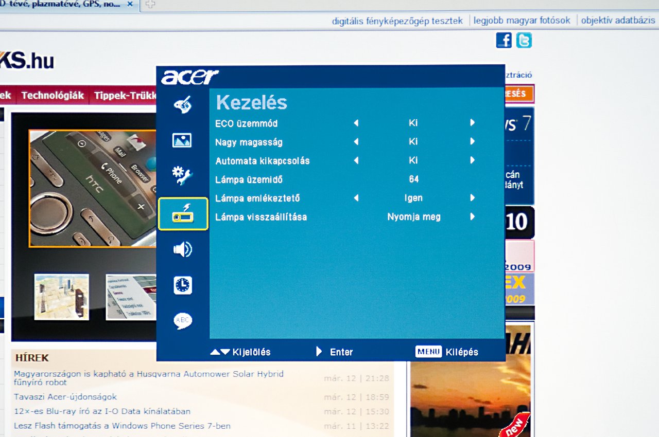 A rendelkezésünkre álló beállítások száma természetesen függ attól, hogy milyen bemenetet használunk, de általánosságban csak közepes szintűek. Kifejezetten jópofa viszont a Szín menüben a Fal színe opció: ezzel színes fal esetén is többé-kevésbé színhelyes képet kapunk. Az Acertől megszokott módon van Empowering menü is – ezt az E betűvel jelölt zöld gombbal hívhatjuk elő, és tetszés szerint a hétféle üzemmódot, a képernyőn megjelenő visszaszámlálót vagy az ePower Management nevű, az ECO üzemmódot, a nagy magasságban szükséges erősebb hűtést és az automata kikapcsolást engedélyező menüt érhetjük el vele.