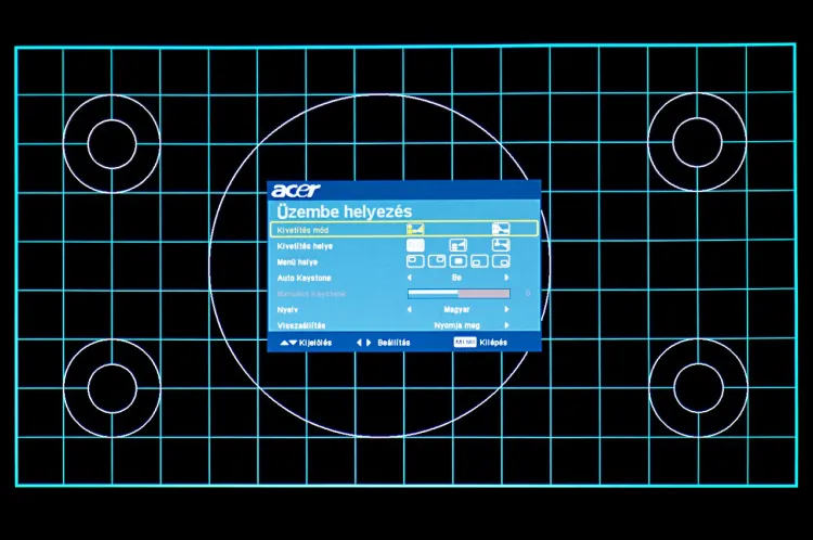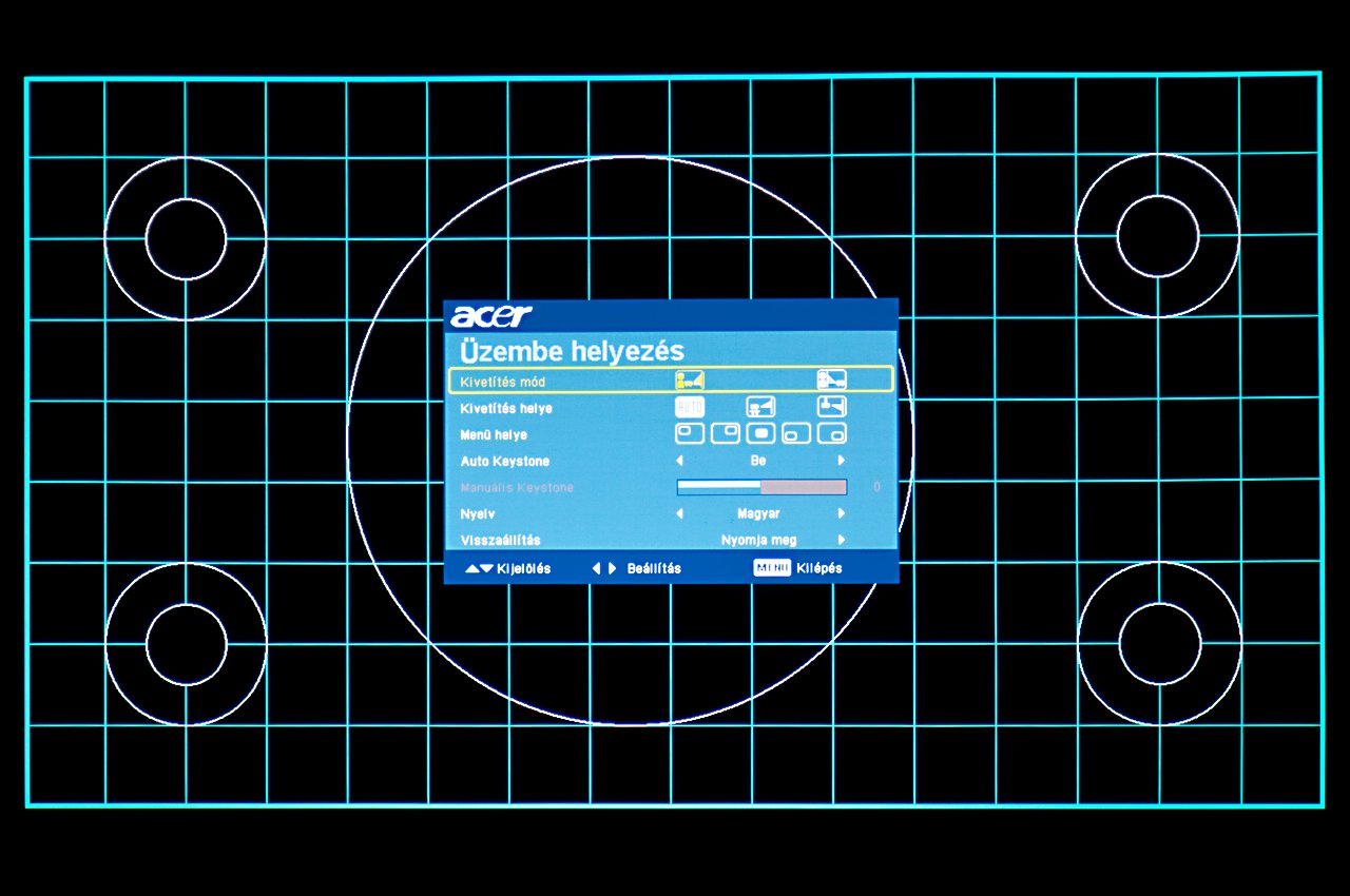A készülék bekapcsolásakor, ha nincs jel, csak az Üzembe helyezés nevű menü áll rendelkezésünkre – ennek háttere ötletesen úgy van kialakítva, hogy segítségével könnyen és gyorsan korrigálhassuk a geometrikus torzításokat. Bár a H5360 rendelkezik manuális és automatikus trapézkorrekcióval is, házimozizáshoz igenis állítsuk be úgy a rendszert, hogy erre ne legyen szükség – az ilyen digitális megoldások sokat rontanak a képminőségen.
