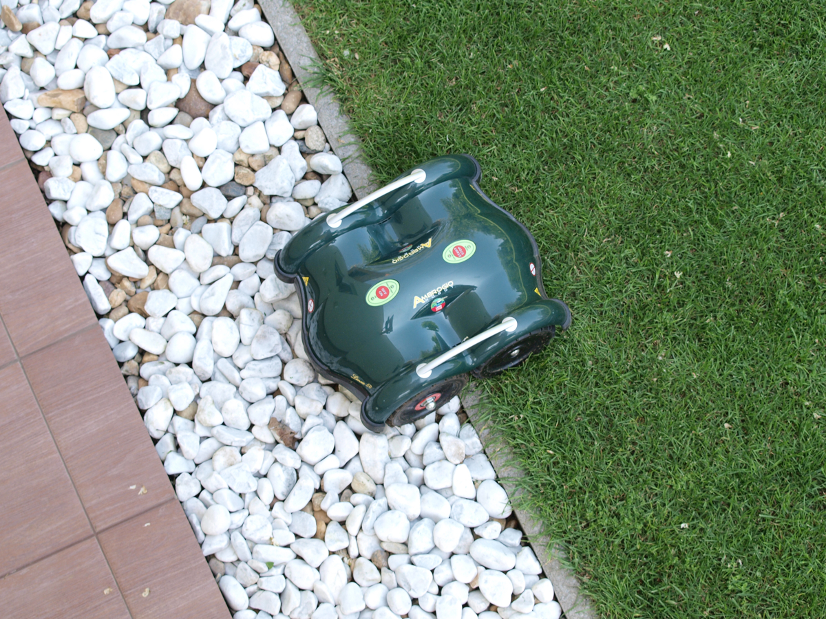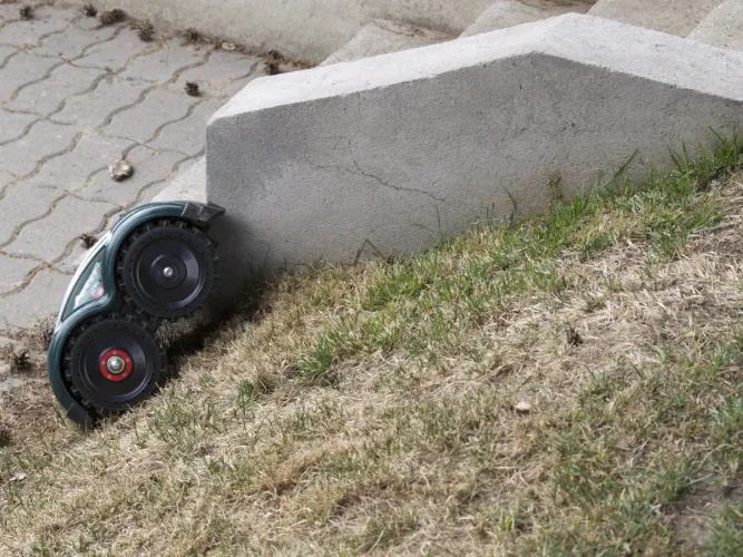 A többi szabály a pázsit és az azon lévő akadályok határolására vonatkozik. A legegyszerűbb helyzet, amikor a fű szintben találkozik egy járdával. A járda betonját vagy burkolatát a fűérzékelő hibátlanul felismeri, így a betonra kb. 20 cm mélyen megy csak be. Ez pont arra jó, hogy a széleken is gyönyörűen lenyírja a füvet.