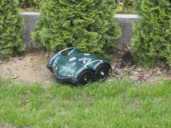 Nincs különösebb gond a bokroknál sem. Ezek alatt általában nincs fű, így az L50-es az ütközést és a fű hiányát is észlelheti. Ha a gyep mentén fal van, akkor a falnak (szegélynek) minimum 9 cm magasnak kell lenni, egyébként jó esély van rá, hogy a terepjáró kerekekkel a robot felmászik az akadályra. Ez azt is jelenti, hogy ha egy területről el kell zárni, akkor a fűre tett akadálynak legalább ilyen magasnak kell lennie. Erre a használati útmutató boltív szerűen meghajlított rudakat javasol. A fák kilátszó gyökereit, illetve a nagyon keskeny, hegyes szögben végződő részeket célszerű elkeríteni.