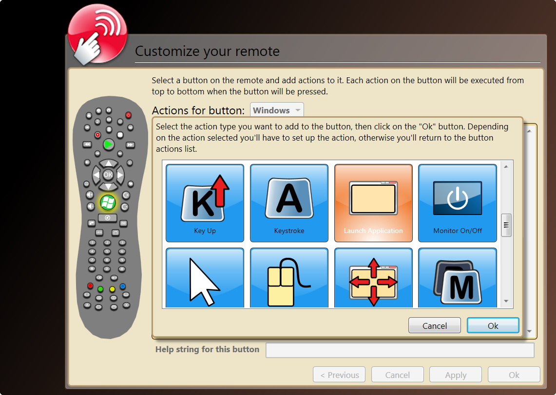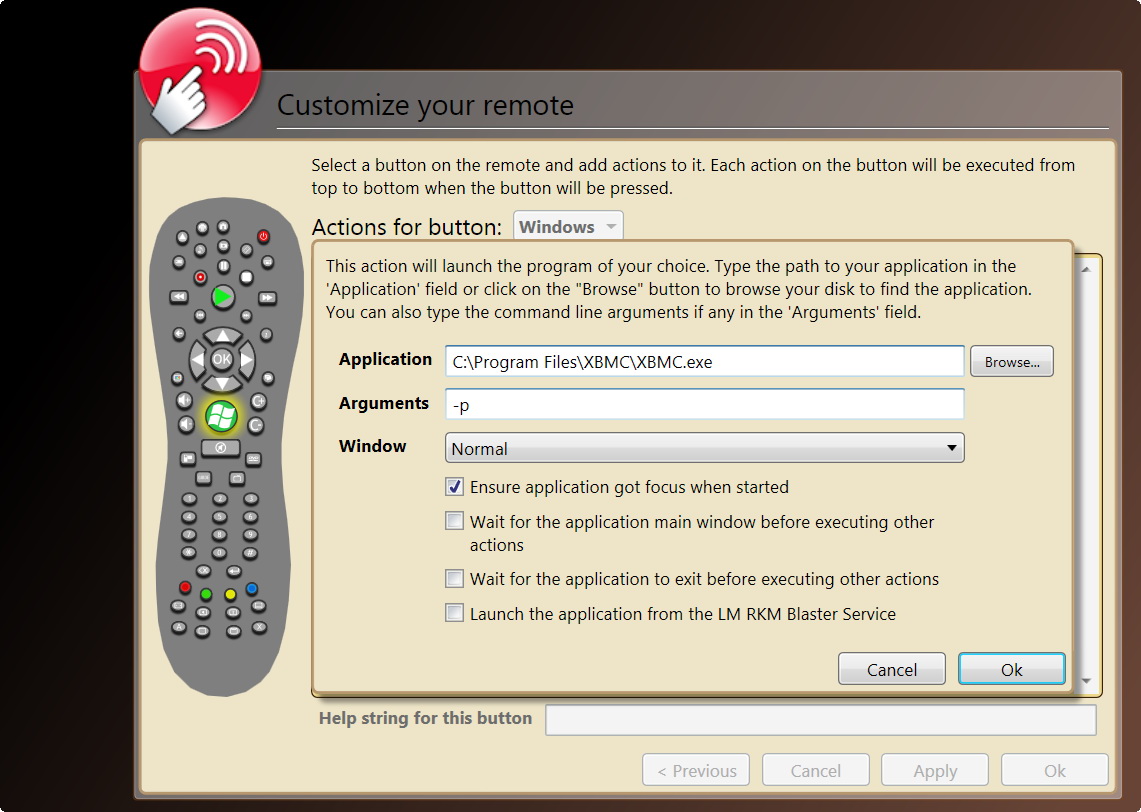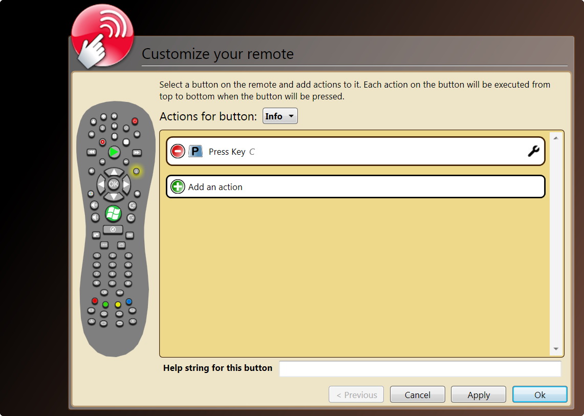 Kattintsunk a zöld gombra, és töröljük a meglévő utasítást, ha van. Ezután az Add an action feliratra kattintva lehet műveletet hozzárendelni a gombokhoz. Az XBMC elindításához a Launch an application, az egyéb műveletekhez pedig a Press Key, azaz billentyű megnyomása lehetőséget kell kiválasztani.