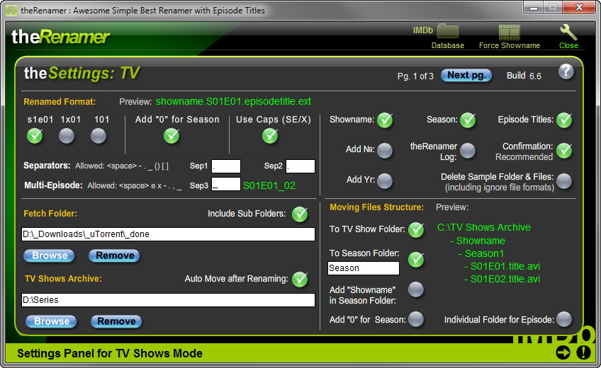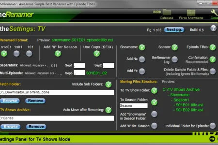 Végül, de nem utolsó sorban, ha azt szeretnénk, hogy a letöltések után még a fájlok átnevezésével se kelljen bajlódni, használjuk a theRenamer programot. Ez az apró alkalmazás internetkapcsolatot igényel a működéshez, de cserébe nagyon hasznos funkciót kínál; a sorozatokat átnevezi egységes, és az XBMC által biztosan értelmezhető formátumra, majd át is másolja nekünk a fájlokat a sorozatok általunk megadott archív mappájába. A theRenamer beállítása nem bonyolult, csupán arra kell figyelni, hogy az alábbi, a képen látható valamennyi opciót beállítsuk – a legfontosabb pedig az, hogy a forrás- és célmappákat is megadjuk!