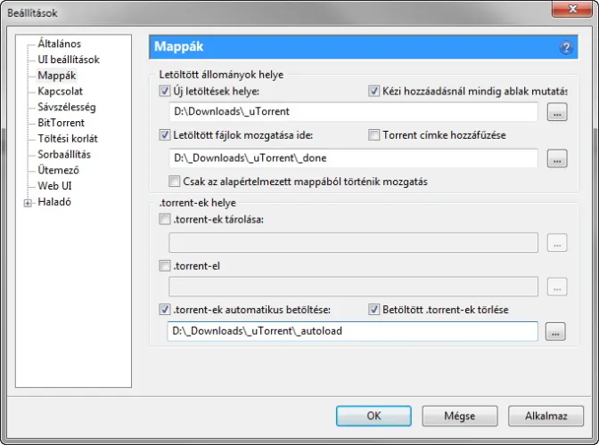 Először is készítsünk egy átmeneti mappát a torrentfájloknak. Állítsuk be a TED-et, hogy minden letöltött torrentfájlt másoljon be ebbe a mappába. Ha megvagyunk, akkor a μTorrentben is be kell állítani ezt a mappát, mégpedig a Beállítások/Mappák fülön, a .torrentek automatikus betöltése mezőnél. Ezzel megoldható, hogy a torrentek automatikusan, a felugró ablak leokézása nélkül azonnal töltődjenek.