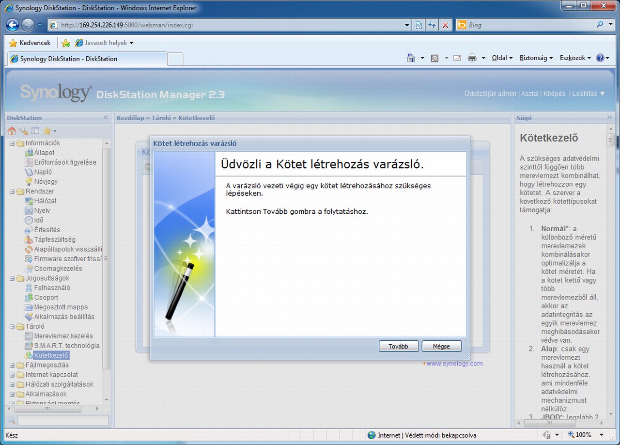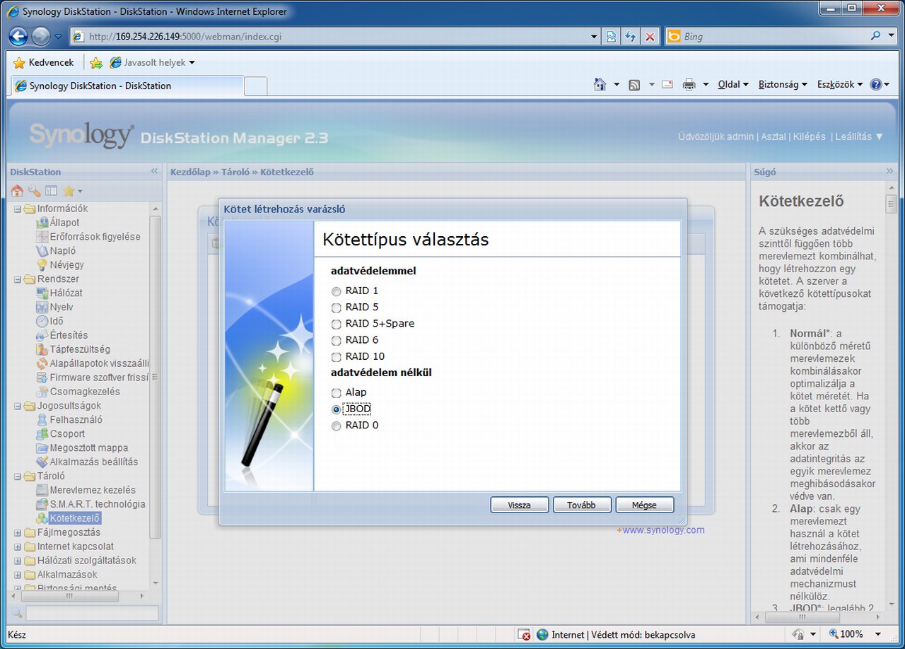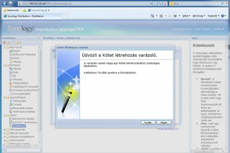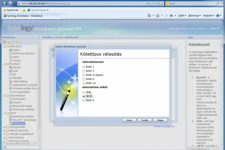Ha készen vagyunk, a böngészőn keresztül már el is érhetjük a DS210j kezelőfelületét. Mindenek előtt a merevlemezeket kell konfigurálnunk a kötetkezelő segítségével. Ebben (és sok más beállításban) varázslók segítenek bennünket, amelyek még akár el is döntik helyettünk, hogy mi a célnak leginkább megfelelő RAID tömb. Ha ezt mi szeretnénk meghatározni, akkor iSCSI célokon kívül (amelyekre otthoni környezetben ritkán van szükség) RAID 0, RAID 1 és JBOD hozható létre. Mi az adatbiztonság/tárkapacitás közötti arány függvényében az utóbbi kettőt javasoljuk (ha fontos az adatbiztonság, akkor RAID 1, ha inkább a tárhely a lényeg, akkor JBOD), a RAID 0 az adatátviteli sebességben nem fog érezhető pluszt jelenteni, ugyanakkor adatbiztonsági szempontból fokozott kockázatot jelent.