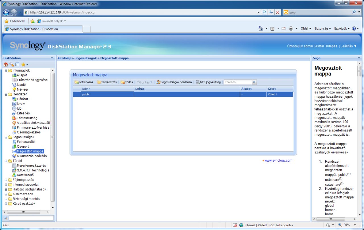 A kötet elkészítése után a NAS még nem áll teljesen készen a használatra, létre kell hoznunk legalább egy megosztott mappát is. Felhasználók beállítására viszont, ha csak egyedül vagyunk, nincs szükség, mivel a mappákat akár teljesen nyitottá is tehetjük. Aki nagyobb szabadságot szeretne annak behatárolásában, hogy ki mihez fér hozzá, természetesen a webes kezelőfelületen ezt is részletesen szabályozhatja. Külön lehetőségünk van például annak meghatározására, hogy a kívülről FTP-n vagy a FileStationnek nevezett webes fájlszerver-szolgáltatáson keresztül érkező felhasználóknak lehetőségük van-e egy adott könyvtárstruktúra böngészésére, illetve hogy tölthetnek-e fel, illetve módosíthatnak-e fájlokat. További érdekesség, hogy nemcsak az adatokhoz, hanem a szolgáltatásokhoz való hozzáférést is felhasználói szinten szabályozhatjuk a szokásos beállítási lehetőségek (home mappa, kvóta, stb.) mellett. A felhasználókat egyébként csoportokba is lehet sorolni, ha pedig sok felhasználót kell egyszerre létrehozni, akkor azt egy megfelelő TXT fájl importálásával is elintézhetjük. Ezt a TXT fájlt nekünk kell létrehoznunk, de Excelben ez villámgyorsan elintézhető, jóval gyorsabban, mint a Disk Station Manager 2.3-ban.