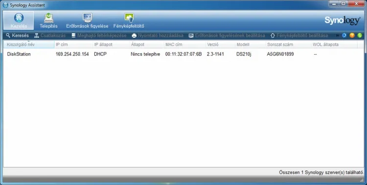 A merevlemezekkel feltöltött NAS-t ezek után csatlakoztatnunk kell a hálózathoz, majd megnyomni a Power gombot. A készülék megkereséséhez érdemes a telepítőlemezen lévő Synology Assistant programot elindítani, ami néhány pillanat alatt megtalálja nekünk a DS210j-t.
