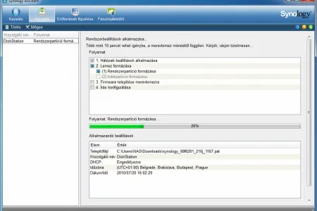 Ha ez megvan, a Telepítés gomb segítségével feltölthetjük rá a CD-n található operációs rendszert, megadhatjuk a NAS nevét, elvégezhetjük az alapvető hálózati beállításokat (IP cím, DHCP használata, idő és így tovább). Magának az operációs rendszernek a telepítése viszonylag hosszú időt vehet igénybe, az Assistant körülbelül 10 percet ír az egész folyamatra, ez tapasztalatunk szerint nagyjából reális is, a valódi idő a mi két 500 GB-os merevlemezünk esetében 7 perc volt.