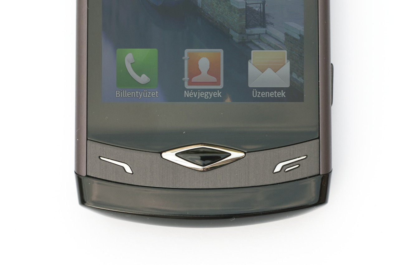 Alul három gombot helyeztek el, a bal oldali a hívások felvételére és indítására szolgál, a középső, rombusz alakú (ez a rombusz több helyen is visszaköszön még) gomb röviden nyomva a főmenüt, hosszan nyomva a feladatkezelőt hívja elő. A jobb oldali gomb a hívások befejezésére és a programok bezárására szolgál, illetve ezzel tudjuk a telefont is ki- és bekapcsolni.