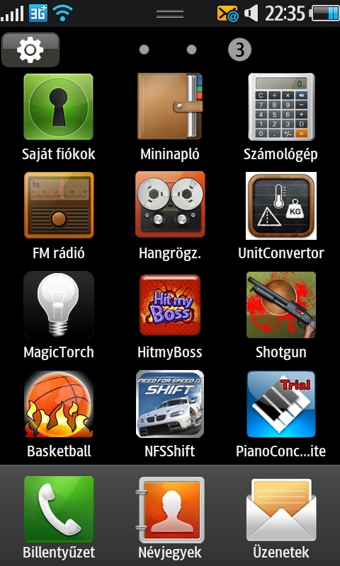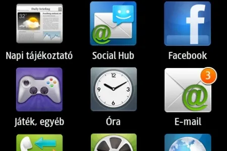 A kijelző legalsó sorában három ikon fogad bennünket, amelyekkel a legfontosabb funkciókat érhetjük el – nevezetesen a telefont, a névjegyeket és az üzeneteket. Ez a sáv szinte mindig velünk van, még az főmenüben is, ami nagyon hasznos, hiszen mindig hozzáférünk az alapdolgokhoz. Ugyanilyen állandó segítséget nyújt a felülről lehúzható státuszsor, amin a fontosabb információk mellett a különféle funkciókat (Bluetooth, WLAN, stb.) kapcsolhatjuk ki- és be, megnézhetjük az értesítéseket, illetve ha zenét hallgatunk, akkor a zenelejátszó fontosabb funkcióit is elérjük.