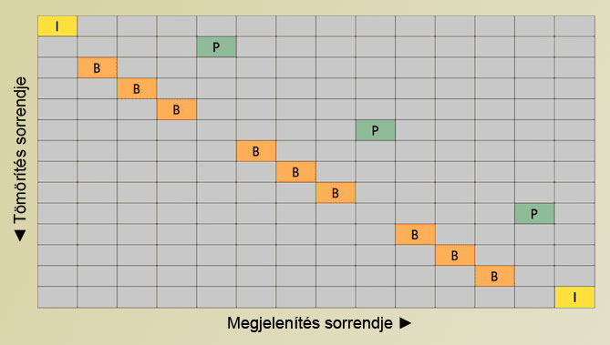 Fontos, hogy a tömörítés során a képkockák feldolgozási sorrendje általában nem azonos a képkockák megjelenítési sorrendjével! H.264 kódolás esetén az első I képkocka után P következik, majd ezt követően néhány B kép készül el, amelyek az I és P között jelennek meg, aztán újabb P, B-k, P, stb. Az alábbi ábra jól szemlélteti mindezt. A képkockatípusok helyigénye csökkenő sorrendben a következő: I-P-B. Logikus módon, minél több B képkockát tud alkalmazni egy tömörítő, annál kisebb méretben tudja ugyanazt az információt eltárolni. A legfejlettebb kodekek B képkockák esetében akár három vagy négy képkockára is tudnak hivatkozni.