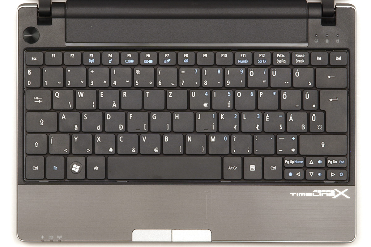 A billentyűzeten nem sokat változtatott az Acer az elődhöz képest – mondhatni semmit, gyakorlatilag ugyanakkora és ugyanolyan gombokat kapunk, a felső sorban elhelyezett plusz funkciógombokkal. A klaviatúra nem túl merev, a közepe gépelésnél már kis erő hatására is besüllyed. Extra kapcsolóból viszont egyet sem kapunk, eltűnt ugyanis a Bluetoothhoz és a WLAN-hoz tartozó külön kis csúszka a gép elejéről. Ezeket az adaptereket az Fn+F3 gombok megnyomásával előhívható kis panellel tudjuk ki- és bekapcsolni. Ami a többi Fn+Fx kombinációt illeti, az F4-gyel a készenléti üzemmódot kapcsolhatjuk be, az F5-tel a csatlakoztatott képernyők között válthatunk, az F6 kikapcsolja a monitor háttérvilágítását, az F7 a tapipadot, az F8 pedig a hangszórót. A hangerő és a fényerő beállítása a kurzormozgató gombokkal lehetséges. A visszajelző LED-ek egyik része a billentyűzet feletti részre került (jobbra a HDD/CAPS Lock/Num Lock fényei, balra, az alumíniumból készült bekapcsoló gombban pedig a működést jelző LED találhatók). A többi LED a csuklótámasz bal első élére került, így a töltést jelző lámpa, a Wi-Fi fénye valamint a második bekapcsolást jelző LED a gép csukott állapotában is láthatók.