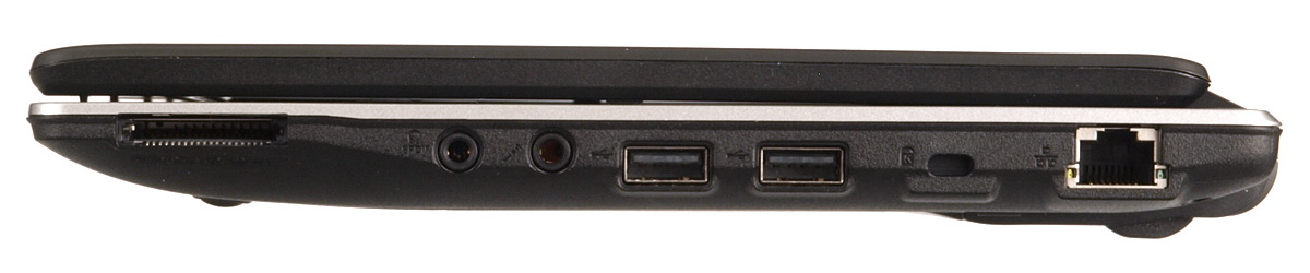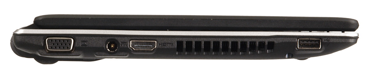 A gép bal oldalán, elölről hátrafelé haladva, elsőként az egyik USB csatlakozót láthatjuk, majd a szellőzőrendszer kimenete következik. Ezután jön a HDMI, a tápcsatlakozó és a D-Sub kimenet.