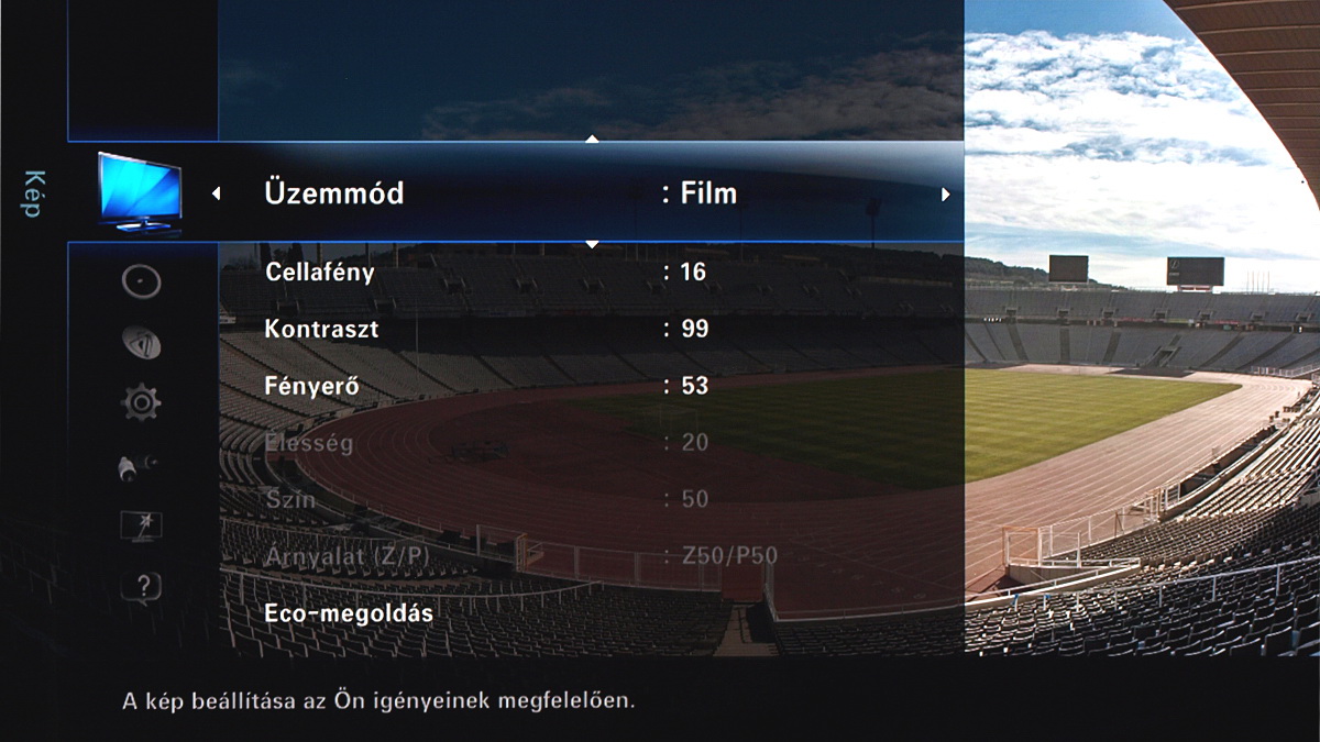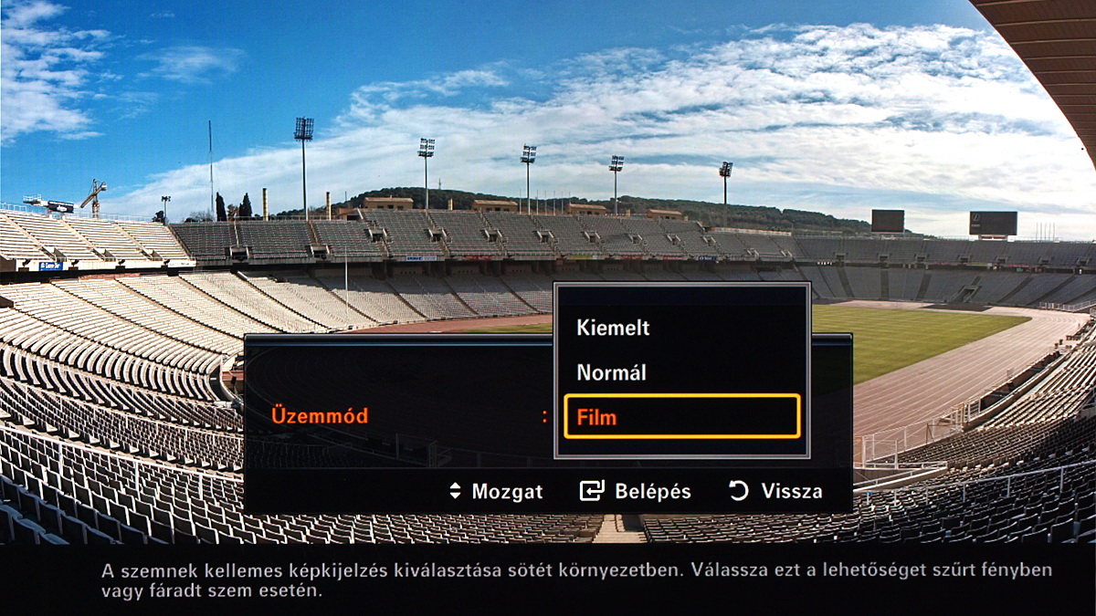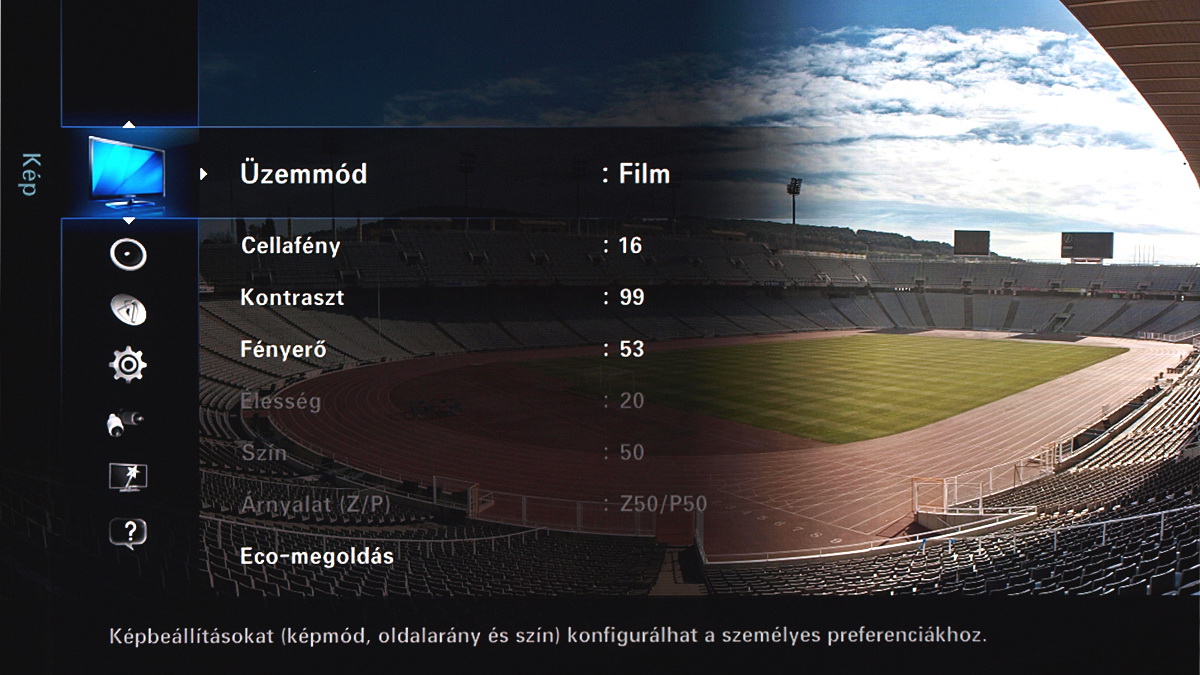 A menü természetesen nagyrészt szöveges, viszont a fő csoportokat (kép, hang, csatlakozók stb.) grafikus ikonok jelzik. A kezelhetőségre összességében nem panaszkodhatunk, már csak azért sem mert az egyébként egyszerű külsejű távirányítóval a legfontosabb paramétereket mind közvetlenül állíthatjuk.