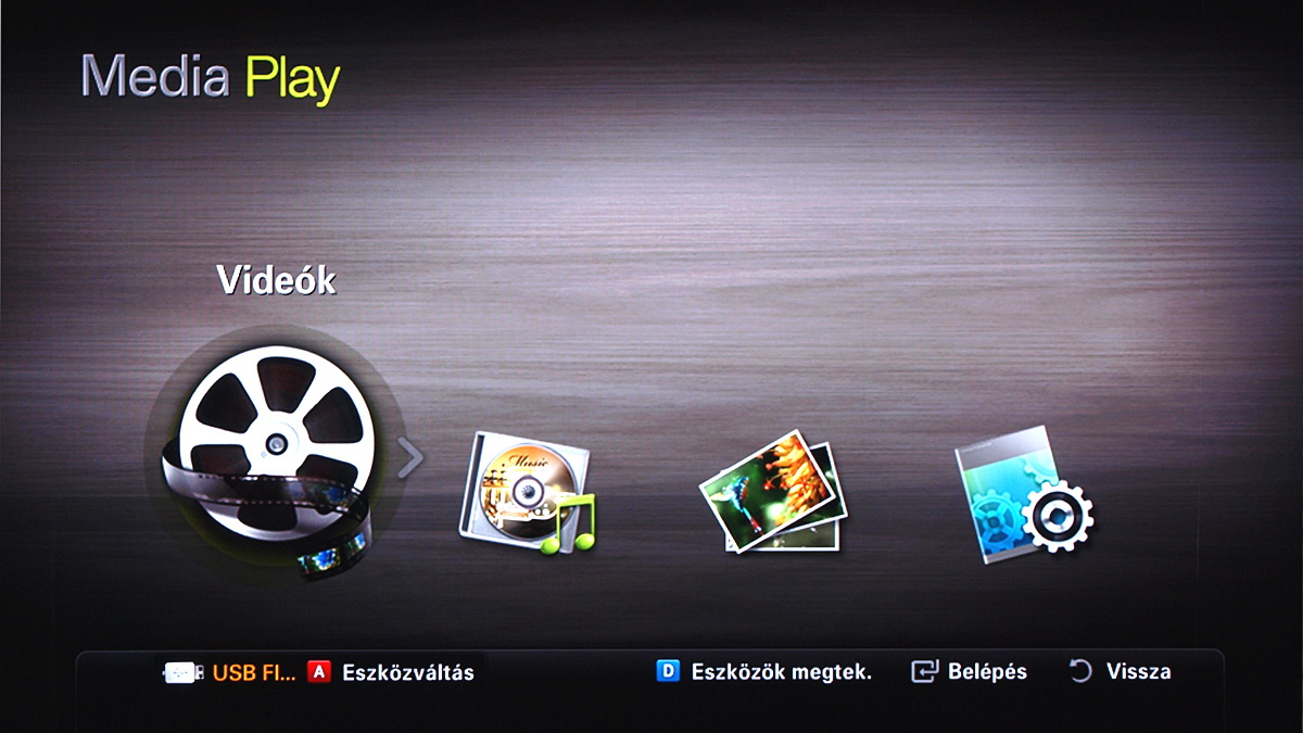 A médialejátszó kezdőképernyőjén négy ikon látható, az első hárommal a filmekhez, képekhez és zenékhez férhetünk hozzá (azaz előre ki kell választani, hogy milyen típusú médiumokat keresünk), a negyedik ikon pedig a beállításokhoz visz, de itt igazából semmi érdekeset nem találunk.