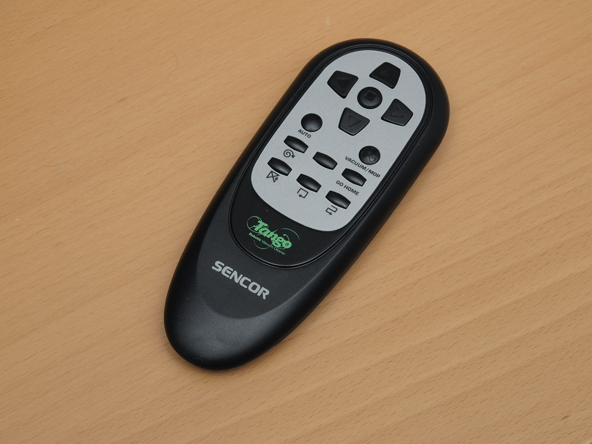A készülékhez a gyártó egy egész pofás infravörös távirányítót is mellékel. Az előlap felső részén lévő négy iránygomb és a közöttük lévő stop gomb a robot manuális irányítására szolgál. Az alattuk lévő Auto gombbal az automatikus takarítási mód választható ki, míg a Vacuum / Mop gomb értelem szerűen a porszívózás és a portörlés funkciók közötti váltásra szolgál. A következő sor középső gombjának nincs funkciója, de a jobb oldali gombbal dokkoltatni lehet a robotot, a bal oldalival pedig spirális takarítást lehet kérni. Ez utóbbi érdekessége, hogy ha a robot a spirális takarítás közben ütközik, akkor automatikus módba kapcsol, erre mindenképpen figyeljünk, ha csak egy kisebb terület feltakarítása a cél. A legalsó sorban lévő három gomb három működési módot aktivál: véletlenszerű mozgás, falkövetés és Z alakú mozgás.