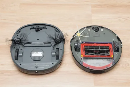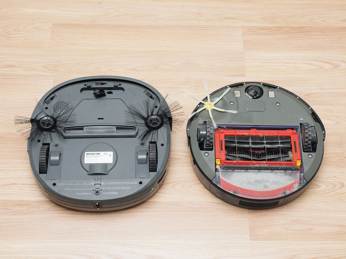Ha a robotot megfordítjuk, akkor az is kiderül, hogy miért. Az egyszerűsítés jegyében az SVC8000-ről lehagyták a hengeres keféket és gumilapátokat, helyettük csak a portartályról lógó szívócsonk néz a padló felé. A Sencor robotja nagyjából úgy működik, ahogy az Európában kapható legtöbb hagyományos porszívó. Azokban sincs forgó kefe vagy egyéb aktív eszköz, egyszerűen a szívóhatásra bízzák a piszkos munkát.