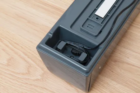 A Sencor SVC8000 dokkolója a szokásosnál nagyobb és bonyolultabb. Ebbe a részbe került ugyanis a robot időzítő része. A kijelzőn az alatta elhelyezett gombok segítségével könnyedén beállítható az idő és a működési nap, illetve az indulási idő. A dokkolót egy mellékelt ragasztószalaggal a falhoz vagy bútor oldalához lehet rögzíteni, amit érdemes is megtenni, egyébként takarítás közben előfordulhat, hogy a robot eltolja azt a helyéről, ezzel lehetetlenné téve esetleg a dokkolást. A dokkoló hátuljában nagyon okosan egy kábelkötegelő részt is kialakítottak, így van hova tekerni a felesleges kábelt, ha a dokkolót a konnektor közelébe telepítjük.