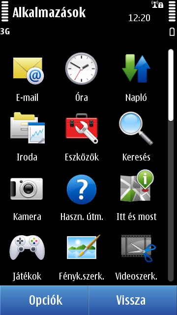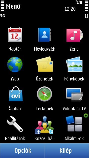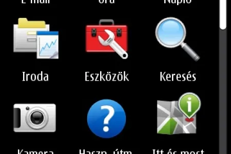 A középső gomb megnyomásával a főmenühöz jutunk, aminek testreszabhatósága viszont már jobb az Androidnál vagy az iPhone-nál: lehetőség van például többszintű könyvtárszerkezet létrehozására, listás és ikonos elrendezésre, stb. A menüben található elemek egyébként szintén ismerősek a korábbi Nokiákból, így a legtöbb felhasználó a minden helyzetben elérhető Súgó nélkül is boldogulhat a C7-tel.
