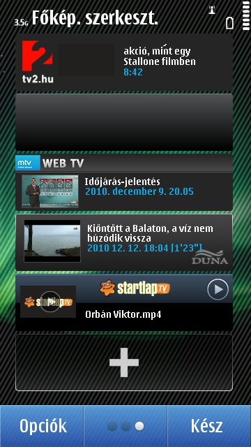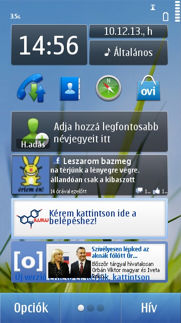 A telefon kezdőképernyője és menü tehát ismerős lesz a korábbi Nokia érintőképernyős telefonok (például 5800, N97, és így tovább) használóinak. Kezdőképernyőből most három áll rendelkezésre, ezen a számon változtatni nem tudunk, és a konfigurálhatóság is elmarad a konkurens megoldások testreszabhatóságától. A képernyőkre mi magunk pakolhatunk ki úgynevezett webeszközöket, amelyek mind egy-egy sort foglalnak el az álló helyzetű képernyőn (fektetve pedig két hasábot kapunk) – így összesen 18 feltölthető helyünk van. A programok, internetes könyvjelzők megjelenítése kicsit nehézkes, mert csak úgy férünk hozzá ezekhez, ha a Hivatkozás névre hallgató „webeszközt” használjuk. Ezen négy alkalmazásnak és/vagy könyvjelzőnek van hely, segítségével egy iPhone-os kinézetű kezdőképernyőt is készíthetünk.