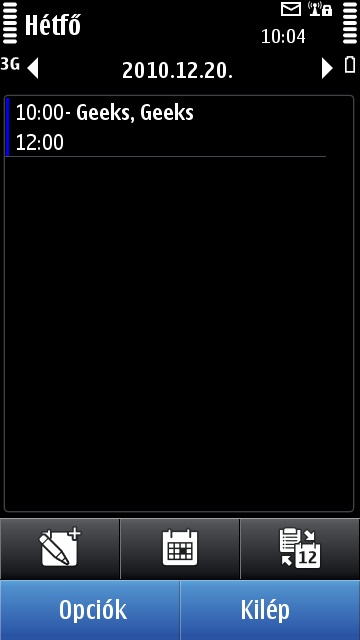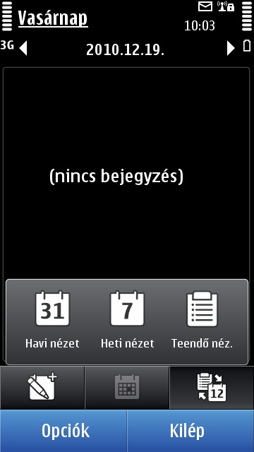 Bár az üzletembereknek az E szériát ajánlja a Nokia, a teendők nyilvántartására a C7 is teljesen megfelel. A naptár rész jól működik, az induló havi nézetből villámgyorsan válthatunk a heti és napi bontásra az alsó három gomb közül a jobb szélsőt megérintve. Innen érhető el egy teendők lista is, amely ráadásul a programoktól különálló funkciót kapott: a bejegyzésekhez ugyanis határidőket is megadhatunk.