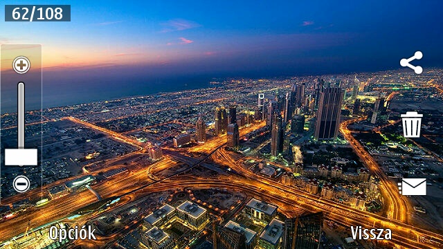 A Galéria apró előnézeti képek formájában és könyvtárak szerint csoportosítva mutatja a képeket – és ha szeretnénk, akkor diavetítést is indíthatunk. A képeket szerkeszthetjük is (ekkor a különálló Képszerkesztő alkalmazás indul el), és meg is oszthatjuk őket a beállított közösségi hálózatokon (Facebook, Twitter).